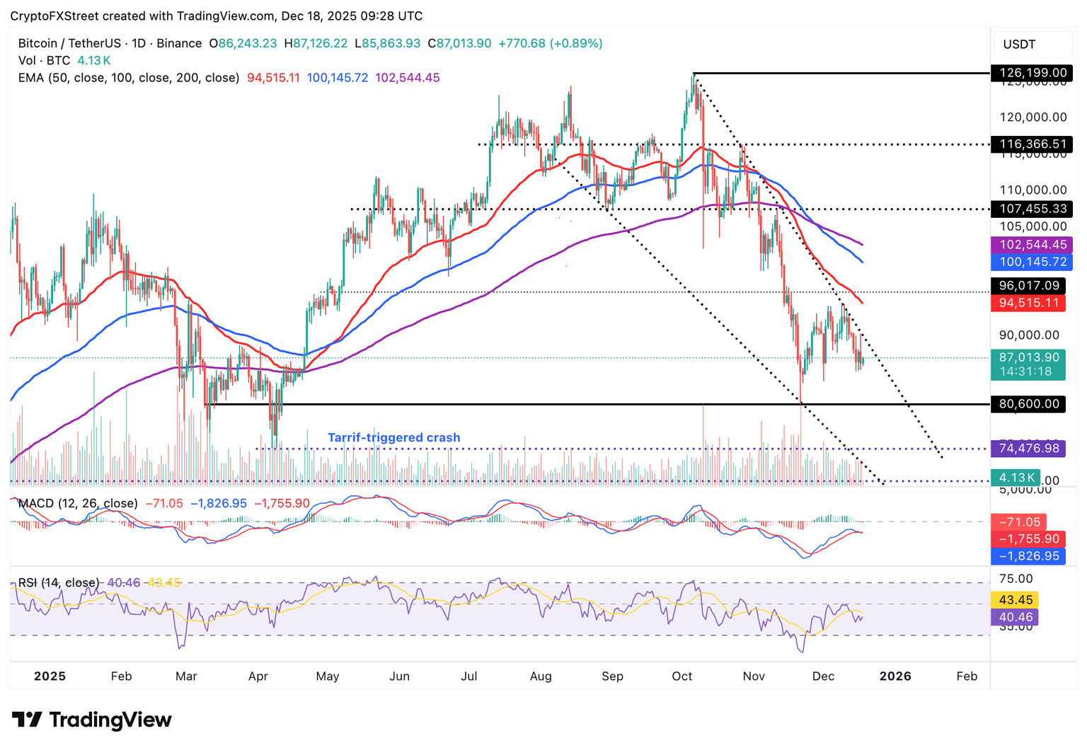 El precio del Bitcoin está luchando por mantenerse por encima de 87.000$ en el momento de escribir este artículo el jueves, después de rebotar desde el mínimo del día anterior de 85.314$. El indicador de Convergencia/Divergencia de Medias Móviles (MACD) está a punto de confirmar una señal de venta en el gráfico diario, lo que se manifestará con la línea azul cruzando y asentándose por debajo de la línea de señal roja.