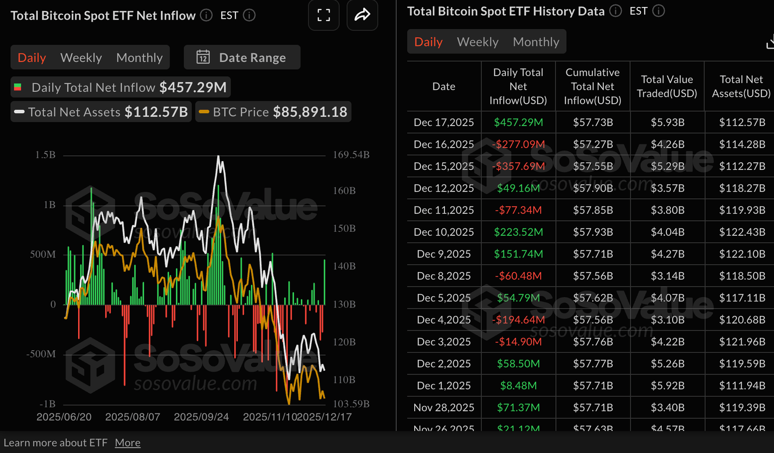 Los ETFs de Bitcoin al contado listados en Estados Unidos (EE.UU.) experimentaron un resurgimiento significativo en las entradas, con aproximadamente 457 millones de dólares depositados el miércoles. Los datos de SoSoValue muestran que la entrada neta acumulativa se sitúa actualmente en 57.730 millones de dólares y los activos netos en 112.570 millones de dólares. Si las entradas se mantienen estables hacia finales de diciembre, el sentimiento del mercado podría mejorar, haciendo que el Bitcoin sea atractivo para los inversores antes del Año Nuevo.