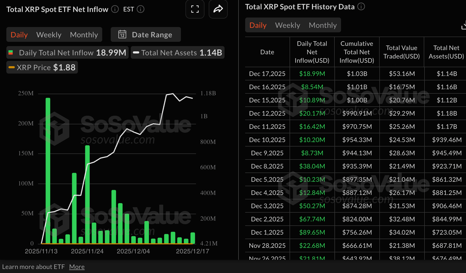 Mientras tanto, las entradas en los ETFs de XRP al contado han sido constantes desde su debut el 13 de noviembre. Aproximadamente 19 millones de dólares fueron depositados en los ETFs de XRP listados en EE.UU. el miércoles, llevando la entrada neta acumulativa a 1.030 millones de dólares y los activos netos a 1.140 millones de dólares, según los datos de SoSoValue.