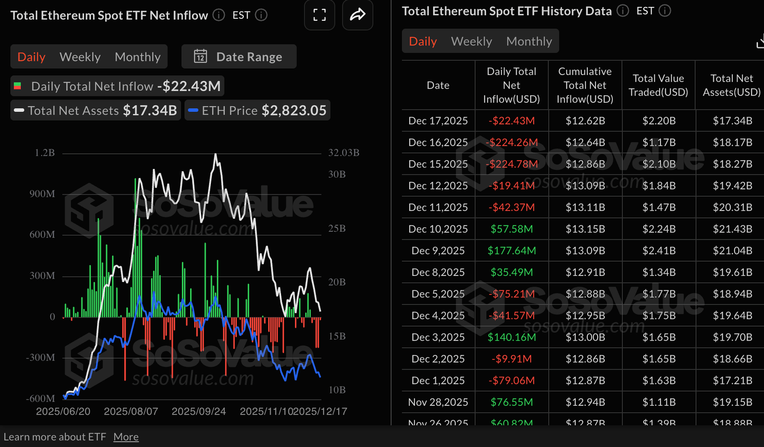- Ethereum defiende el soporte alrededor de 2.800$ mientras que las leves salidas de ETF suprimen su recuperación.