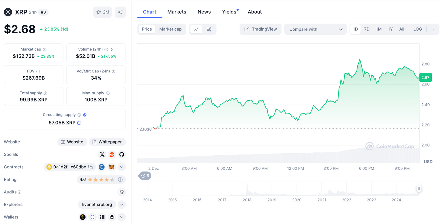 El lunes, el precio de XRP subió más del 20%, cruzando la marca de los 2,7 dólares por primera vez desde 2021. El repunte del precio de XRP fue impulsado por WisdomTree, una importante firma de gestión de activos, que presentó oficialmente ante la SEC una solicitud para un fondo cotizado (ETF) de XRP al contado.