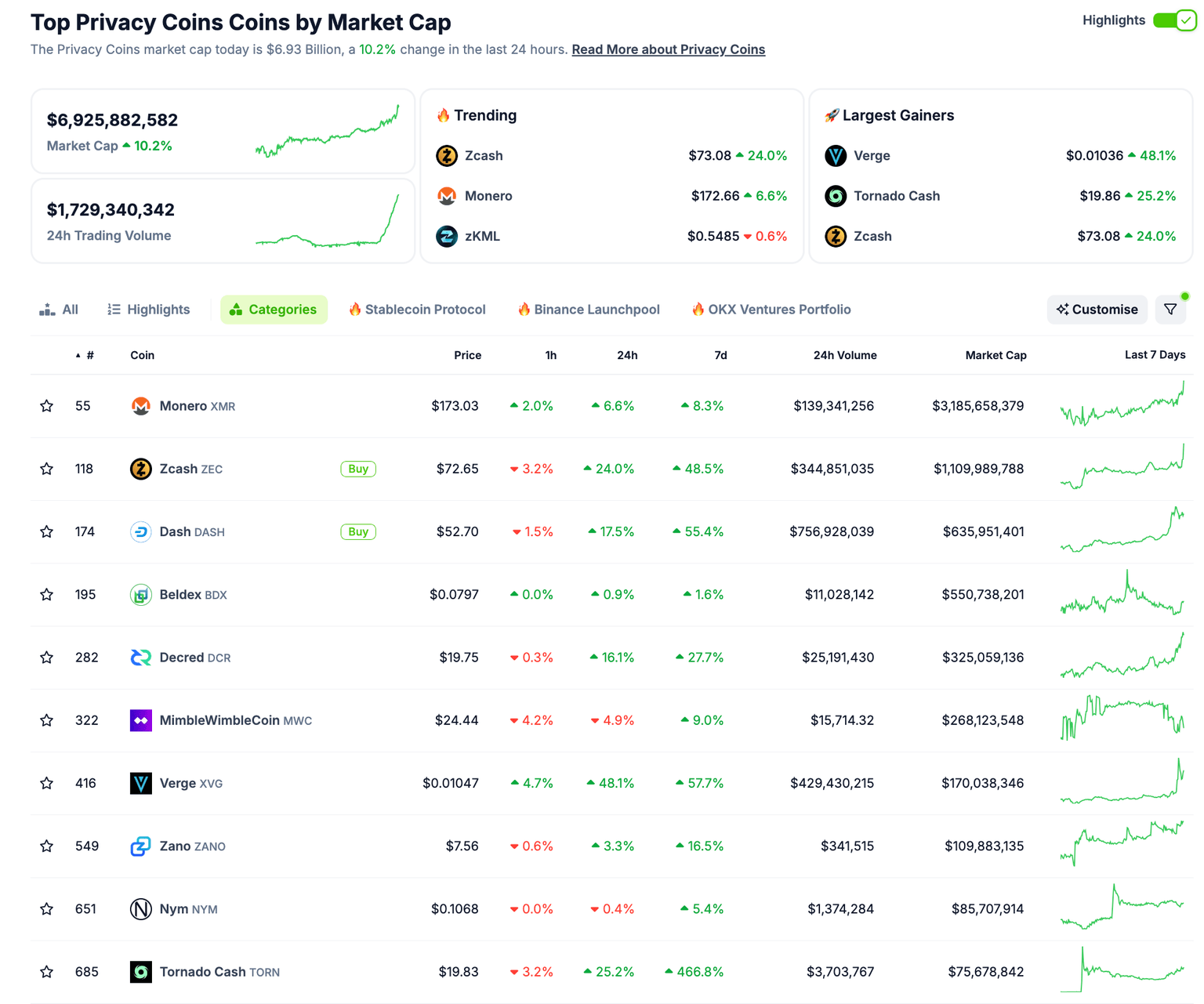 Esto indica un mayor interés de los inversores en activos que priorizan el anonimato y la privacidad transaccional. Tornado Cash (TORN) lideró la carga con un aumento del 25,2%, señalando una renovada confianza entre los entusiastas de las monedas de privacidad.