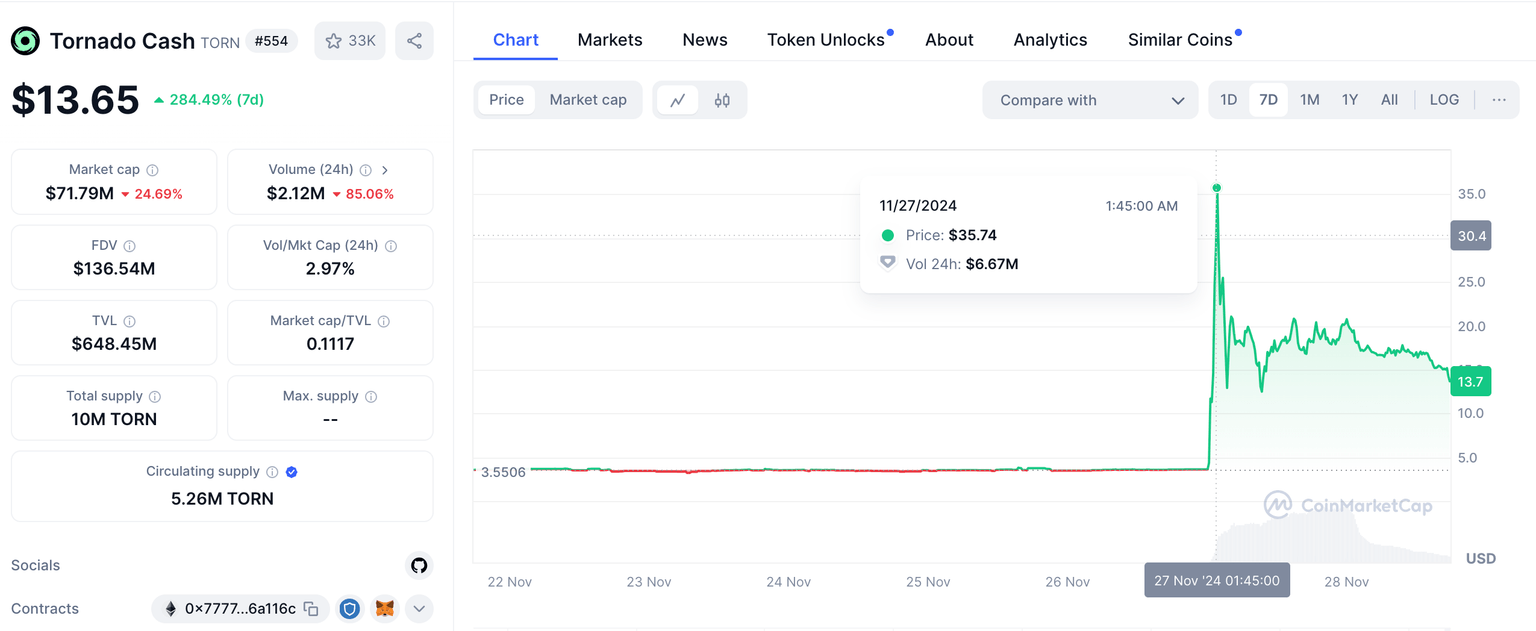 El fallo provocó una reacción masiva en el mercado, con el token de Tornado Cash (TORN) subiendo más del 380% para alcanzar los 35.7$, antes de retroceder hacia los 13.7$ el jueves.