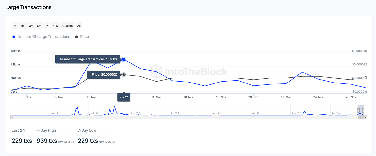 Los datos más recientes muestran que la blockchain de Shiba Inu vio solo 229 grandes transacciones en la red SHIB el 27 de noviembre, reflejando una caída del 85% en la demanda de ballenas desde que Trump anunció el DOGE en la red social X.
