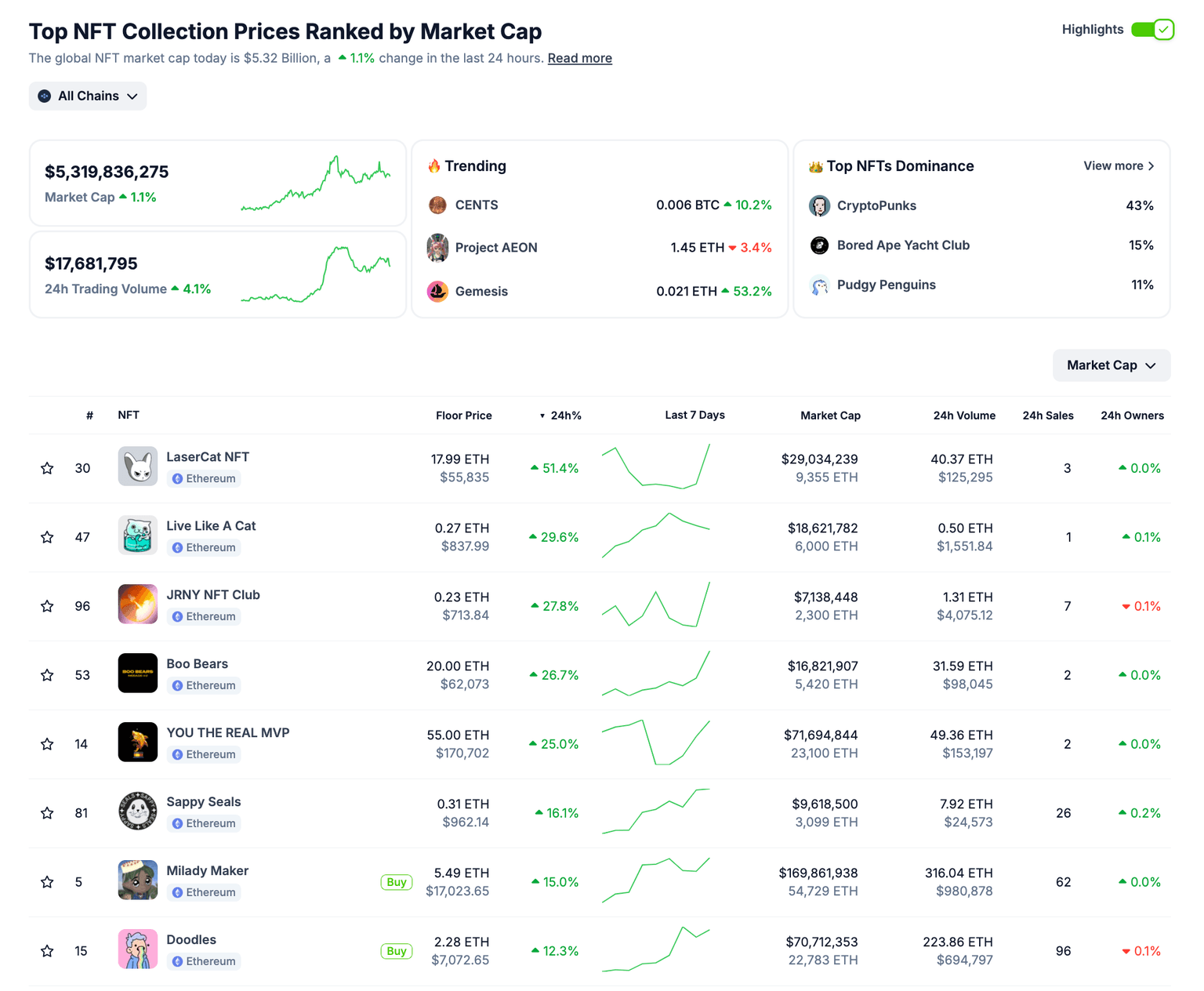 El gráfico de Coingecko arriba muestra el rendimiento comercial acumulado de todos los proyectos NFT listados. El volumen de negociación global de NFT alcanzó los 17,6 millones de dólares el jueves, reflejando un aumento del 4,1% en las últimas 24 horas, mientras que la valoración del sector también creció un 1,1% para alcanzar los 5,3 mil millones de dólares.