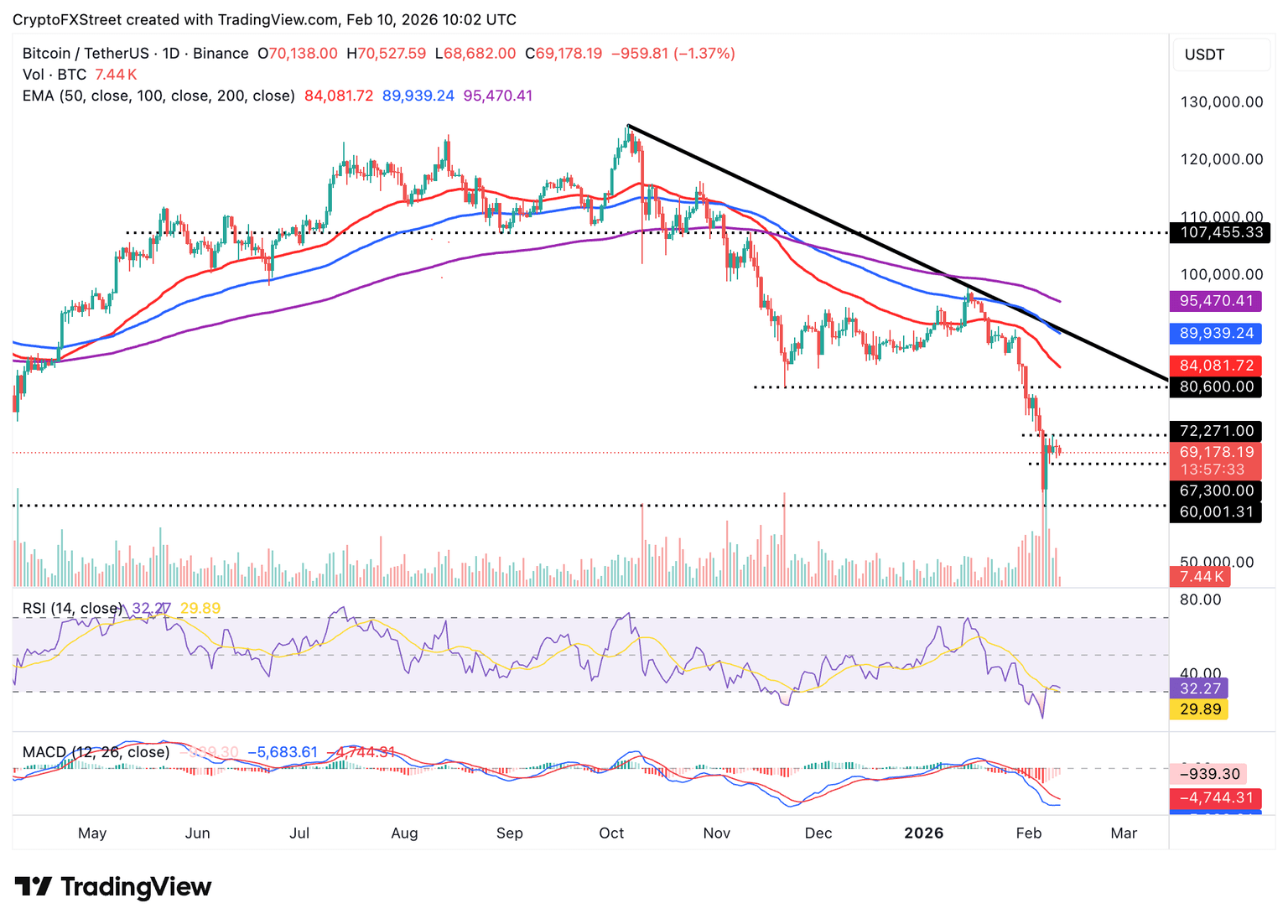 Según el Índice de Fuerza Relativa (RSI) en el mismo gráfico, en 32, el impulso bajista sigue siendo evidente, y los descensos pueden extenderse a corto plazo a menos que el RSI se recupere hacia la línea media. Un regreso para probar el soporte en 67.300$ está en las cartas, mientras que el máximo del domingo de 72.271$ sigue al alcance si los alcistas pueden recuperar el nivel de 70.000$.