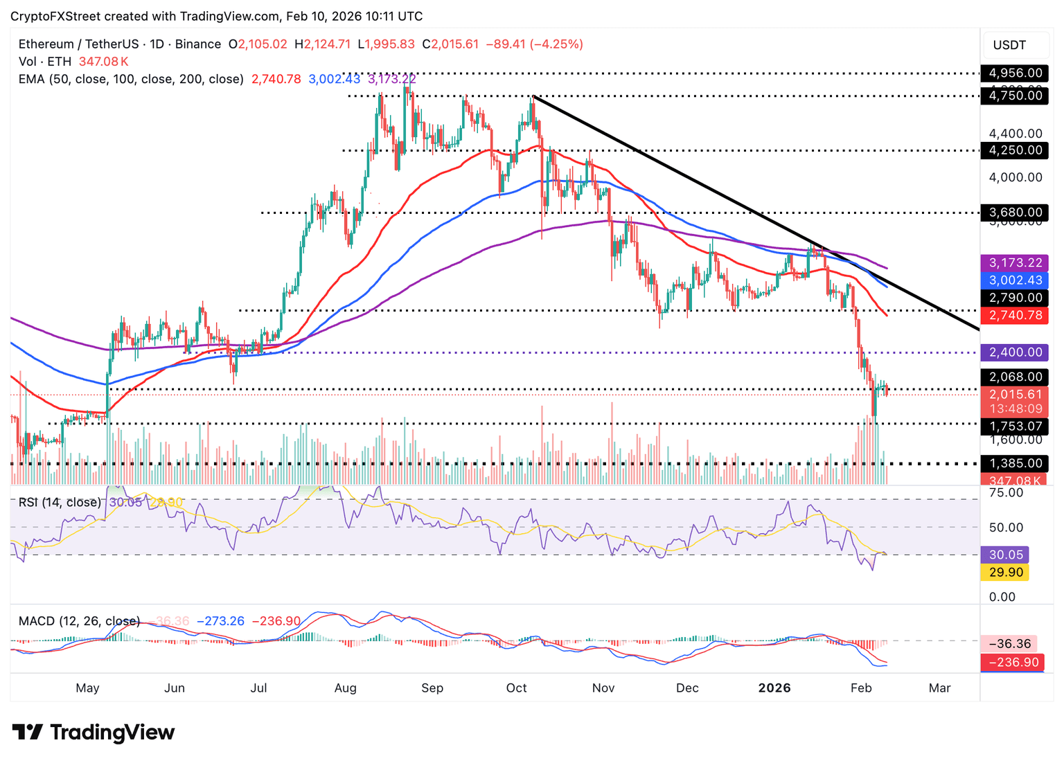 Ethereum se mantiene por encima de 2.000$ como soporte inmediato, pero su imagen técnica a corto plazo se deteriora. Los indicadores técnicos, incluyendo el RSI en 30 y bajando en el gráfico diario, confirman una acumulación continua de impulso bajista.
