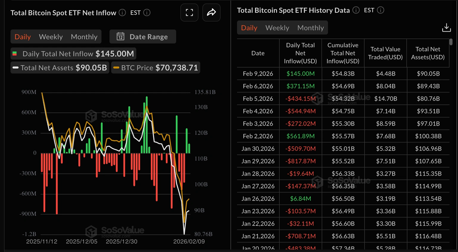 La entrada acumulativa se sitúa en 54.83 mil millones de dólares, con activos netos totales bajo gestión de 90.05 mil millones de dólares. Extender la racha de entradas en los próximos días respaldaría un sentimiento positivo y aumentaría las probabilidades de que Bitcoin supere los 70.000$.