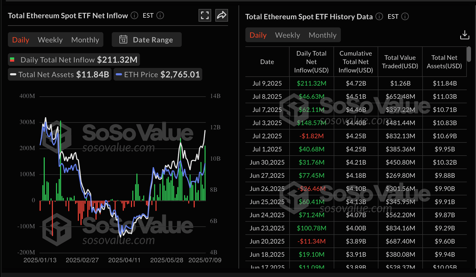 Según los datos de SoSoValue, los ETFs al contado de Ethereum también vieron un aumento significativo en las entradas, totalizando aproximadamente 211 millones de dólares el miércoles. Esto marcó un aumento del 78% en comparación con la entrada del martes de alrededor de 47 millones de dólares, respaldando el creciente interés entre los inversores institucionales. Actualmente, el total acumulado de entradas netas se sitúa en 4.720 millones de dólares, con un total de activos netos de 11.840 millones de dólares.