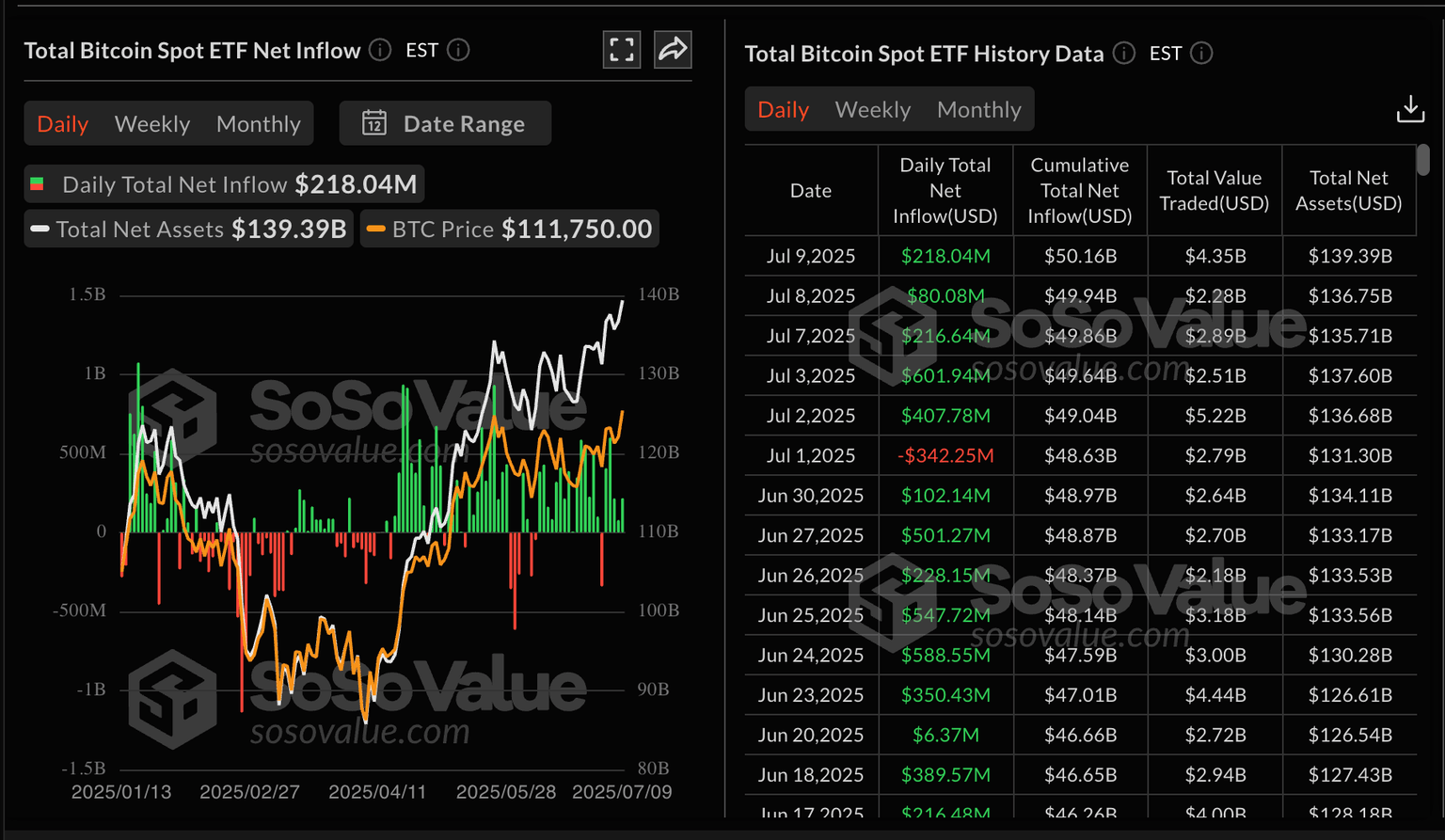 Los ETFs al contado de Bitcoin extendieron la racha alcista por cuarto día consecutivo, con aproximadamente 218 millones de dólares en volumen de entrada neta diaria registrado el miércoles. Esto marcó un aumento significativo desde los 80 millones de dólares de entrada registrados el martes, llevando el total de activos netos a alrededor de 139.400 millones de dólares.