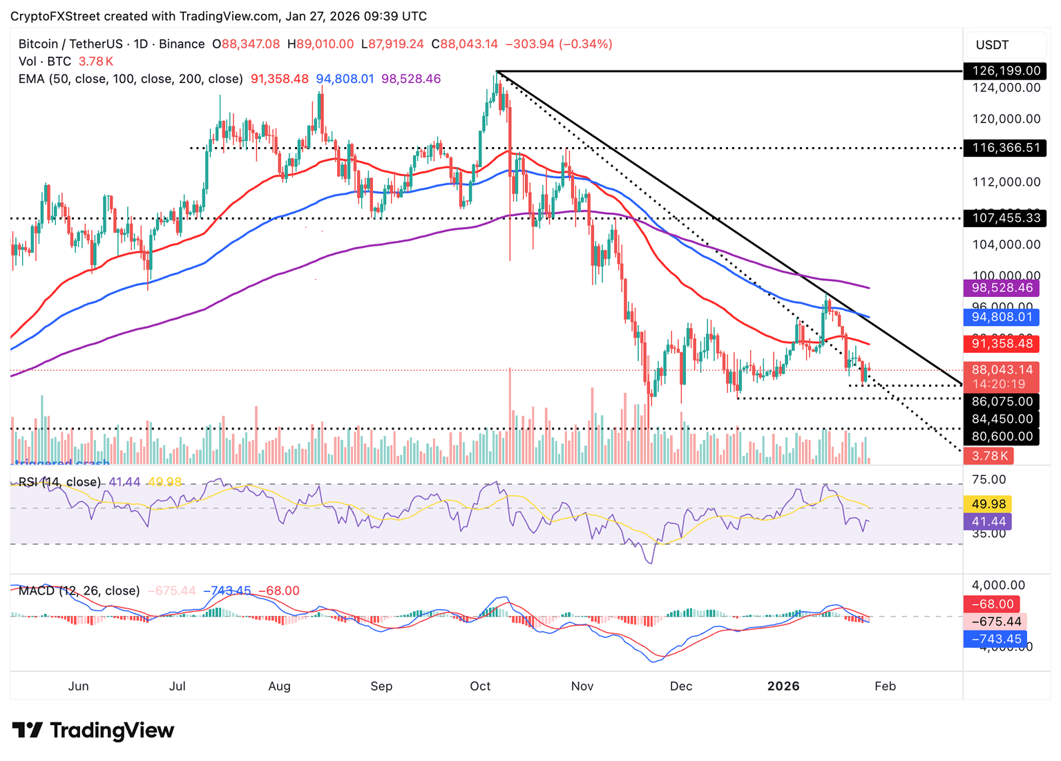 El RSI se sitúa en 41 en el gráfico diario, dirigiéndose hacia territorio de sobreventa, a medida que se acumula el impulso bajista. La línea del MACD refuerza aún más la perspectiva bajista en el mismo gráfico, ya que se mantiene por debajo de la línea de señal.