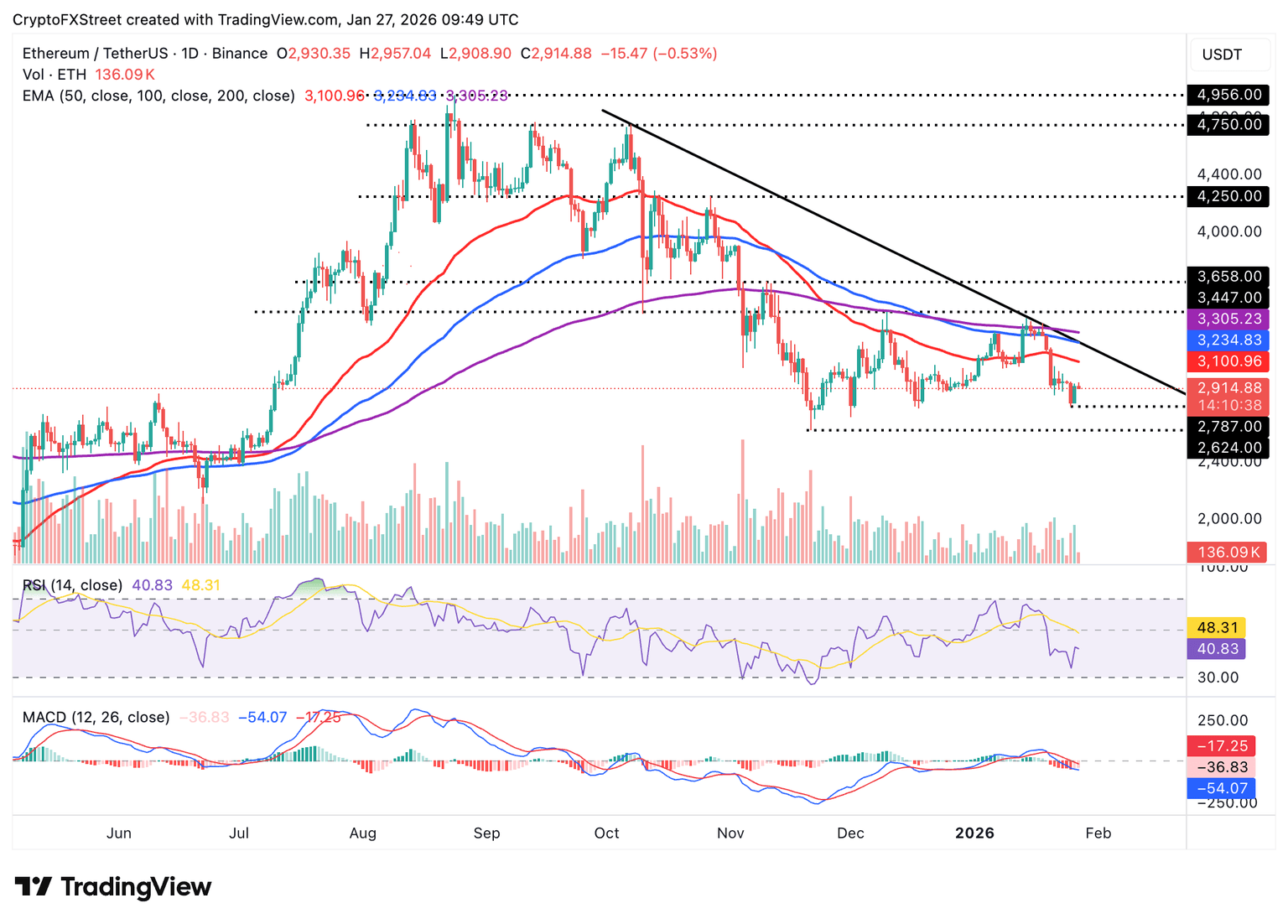 - Ethereum se desliza hacia el nivel de soporte de 2.900$ en medio de indicadores técnicos débiles, con el MACD señalando una tendencia bajista.