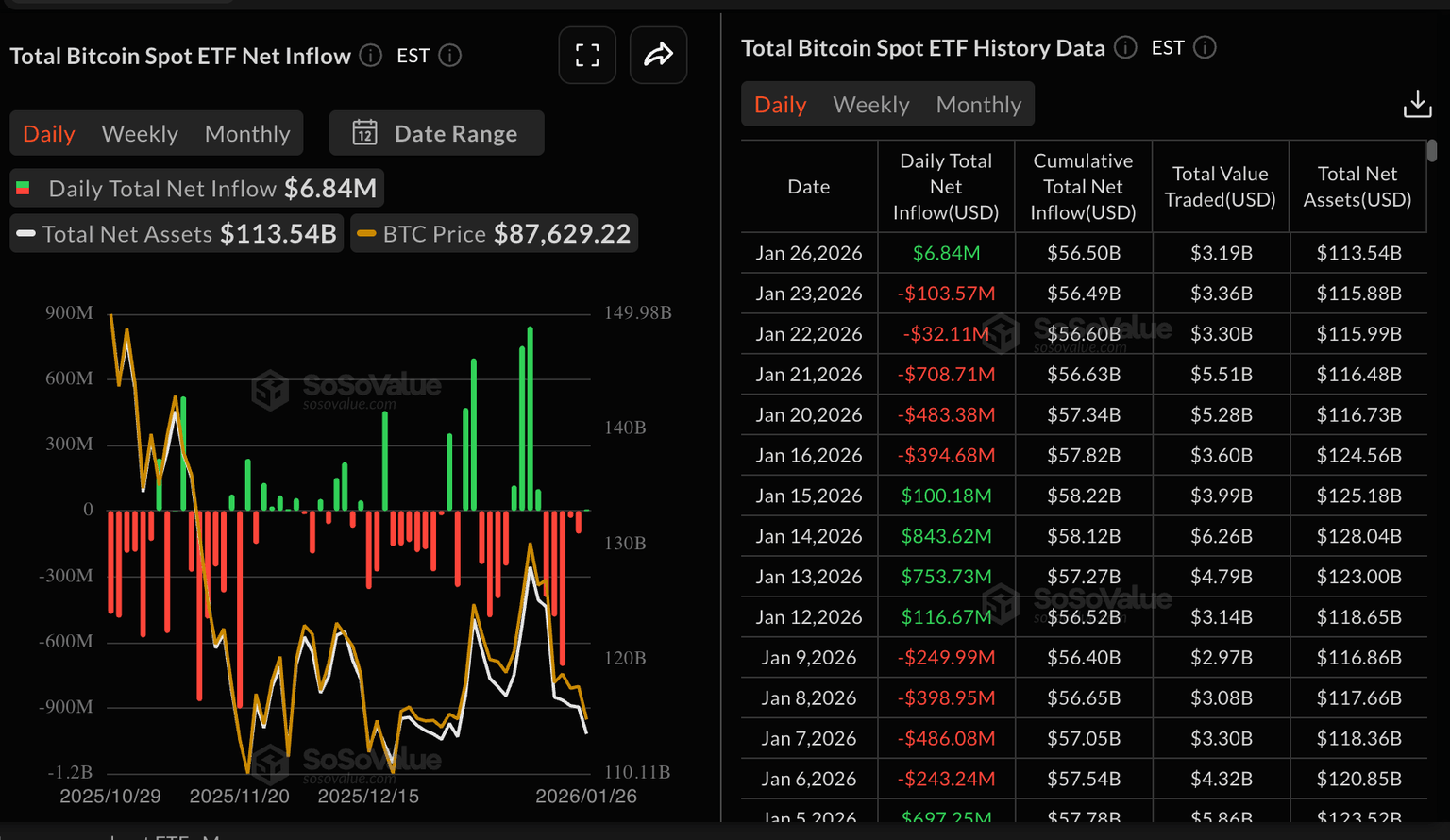 La leve entrada del lunes rompió una tendencia de redención a corto plazo que reflejaba un sentimiento de aversión al riesgo en el mercado de criptomonedas más amplio. Sin embargo, la entrada acumulativa sigue siendo positiva, superando los 56 mil millones de dólares, mientras que los activos netos totales ascienden a 113,5 mil millones de dólares.