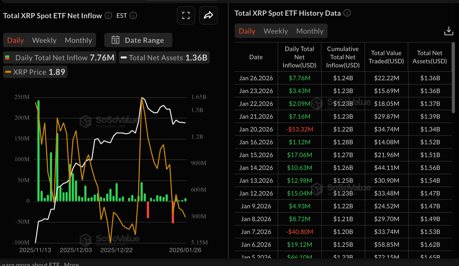 - Los ETF de XRP extienden una racha de cuatro días de entradas, pero la recuperación del precio está limitada por debajo de 2.00$.