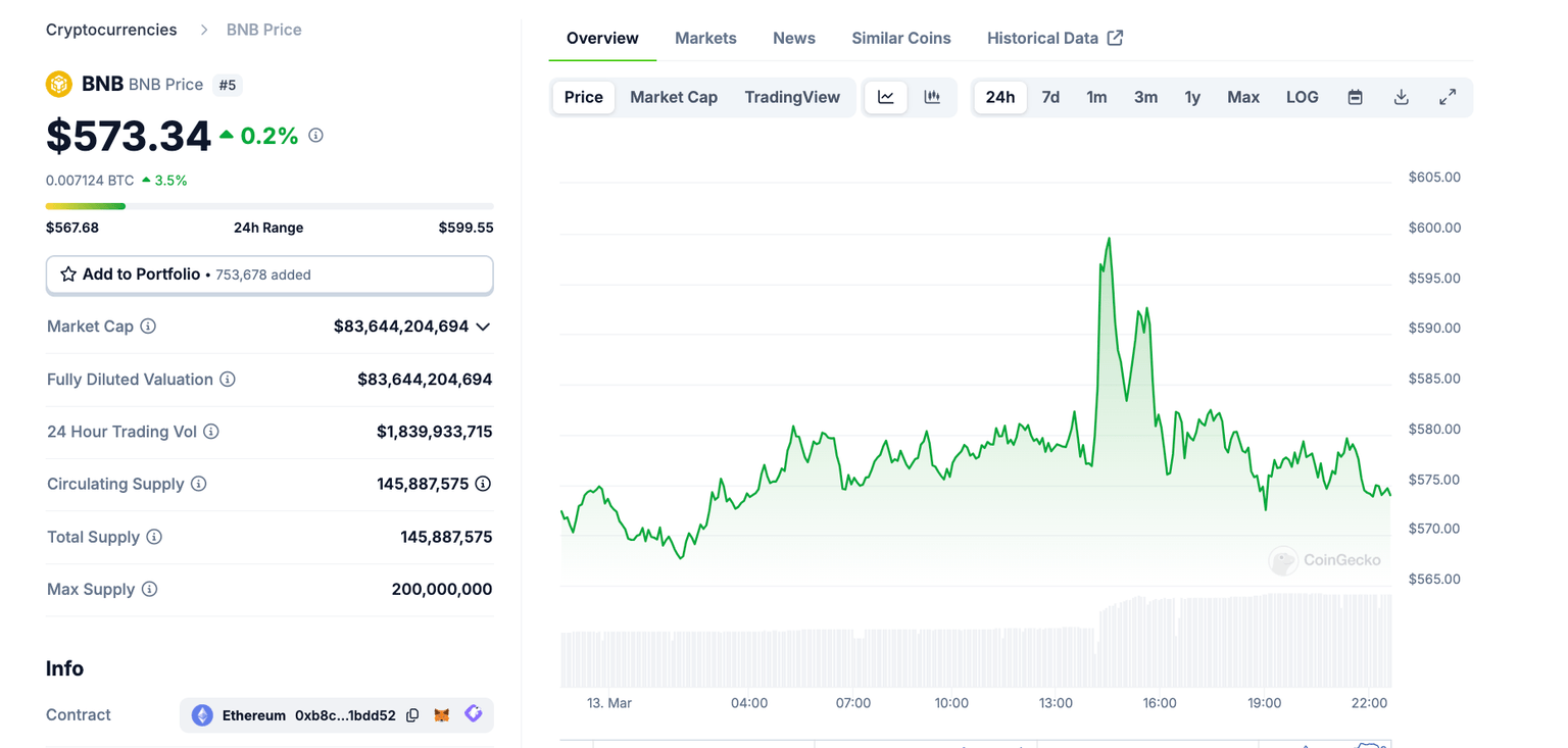 Binance Coin (BNB) fue uno de los pocos ganadores, subiendo un 0.2% y manteniéndose por encima de 570$ a pesar de las caídas generalizadas en el mercado. Sin embargo, los catalizadores contradictorios sugieren que BNB podría experimentar una volatilidad aumentada en los próximos días.