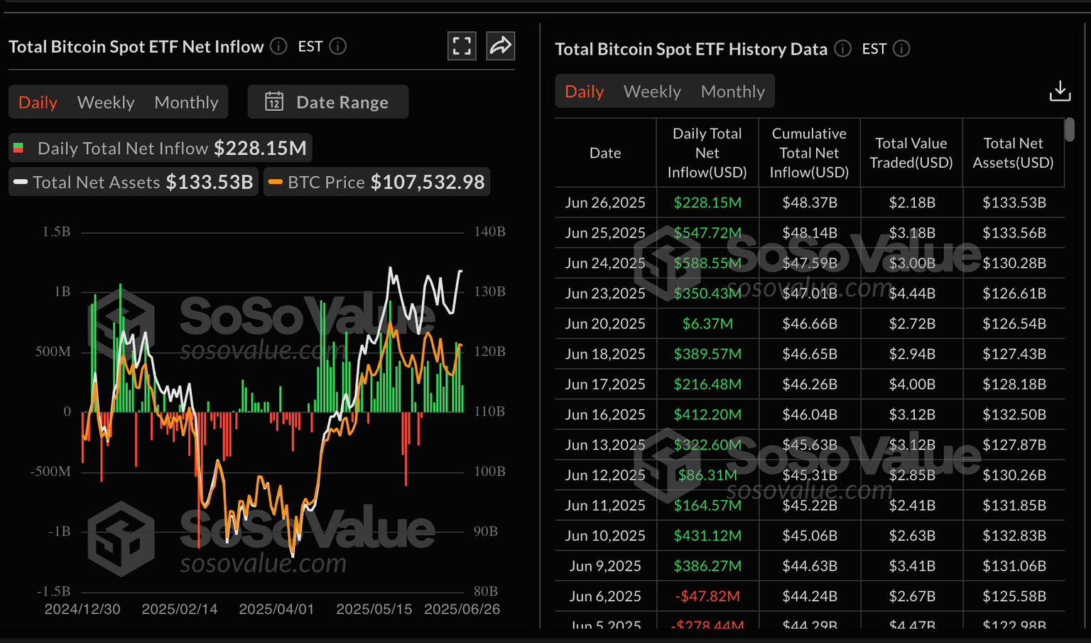 El volumen de entrada neta de los ETFs de Bitcoin al contado alcanzó una racha de 13 días el jueves, con SoSoValue reportando aproximadamente 228 millones de dólares. Aunque significativamente inferior a los 548 millones de dólares registrados el miércoles, el volumen de entrada neta afirma el constante sentimiento de riesgo. En total, los ETFs de Bitcoin al contado han acumulado alrededor de 48.4 millones de dólares en entradas netas, con activos netos promediando casi 134 mil millones de dólares.