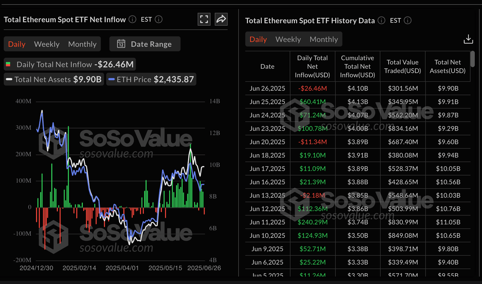 Por otro lado, los ETFs de Ethereum al contado rompieron una racha de tres días de entradas netas el jueves, con salidas sumando aproximadamente 26.5 millones de dólares. Este volumen de salida refleja un interés decreciente de los inversores en altcoins, que continúan luchando por recuperar las pérdidas provocadas después de que EE.UU. atacara sitios nucleares iraníes el sábado.