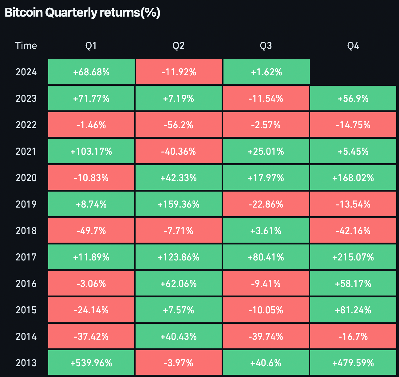 - Bitcoin cotiza a 63.737 $ en el momento de escribir estas líneas el lunes, manteniendo las ganancias del 6% que vio el viernes después de que el presidente de la Reserva Federal (Fed), Jerome Powell, dijera que ha llegado el momento de recortar las tasas de interés en EE.UU., apoyando una recuperación en los activos de riesgo. En términos más generales, el mayor activo criptográfico por capitalización de mercado ha registrado históricamente un rendimiento positivo en el cuarto trimestre la mayoría de las veces, según datos de Coinglass.