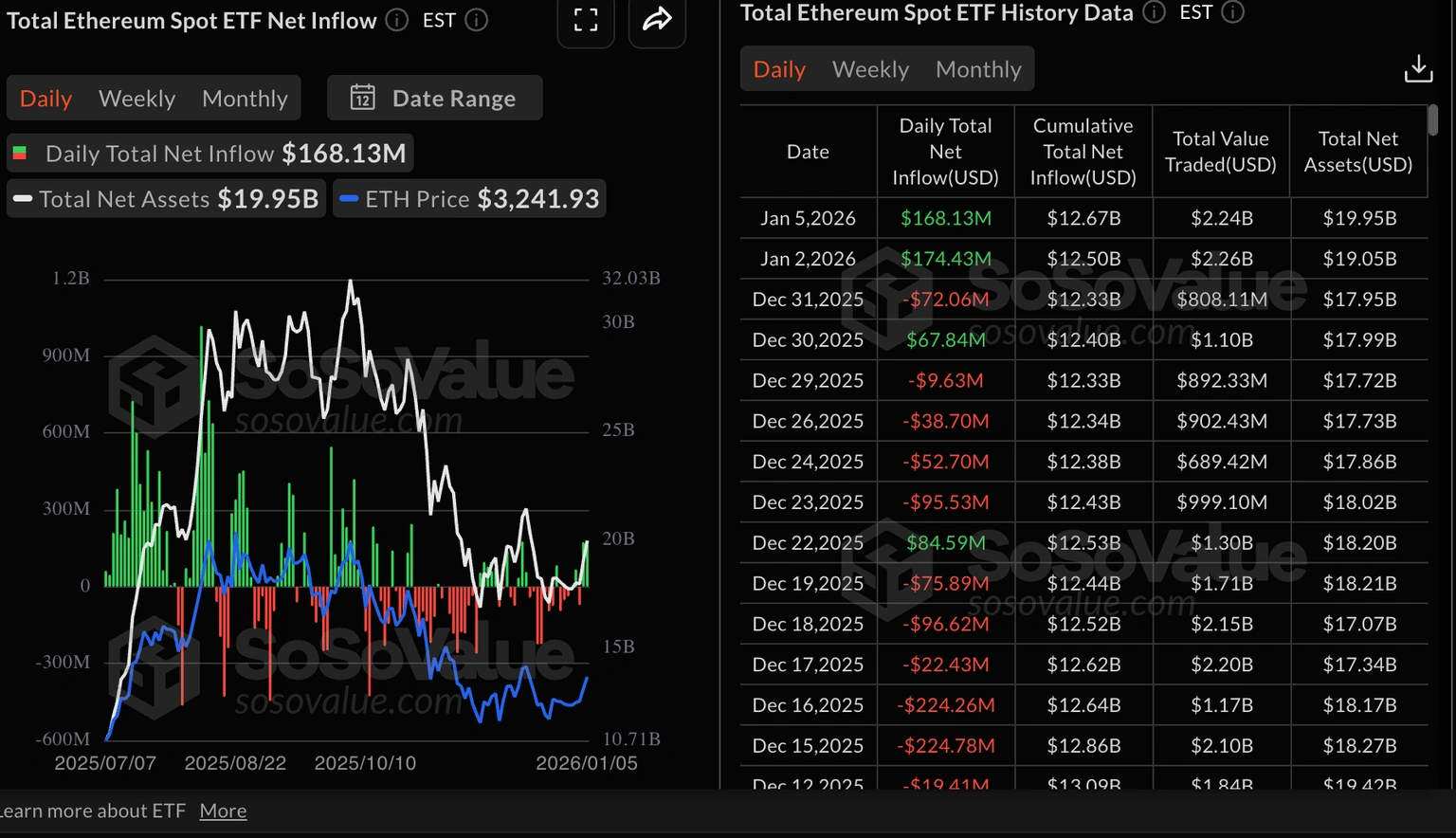Los ETFs de Ethereum, por otro lado, se mantuvieron en el lado de la demanda a pesar de que el volumen de entradas se redujo ligeramente a 168 millones de dólares el lunes desde aproximadamente 174 millones de dólares el viernes.