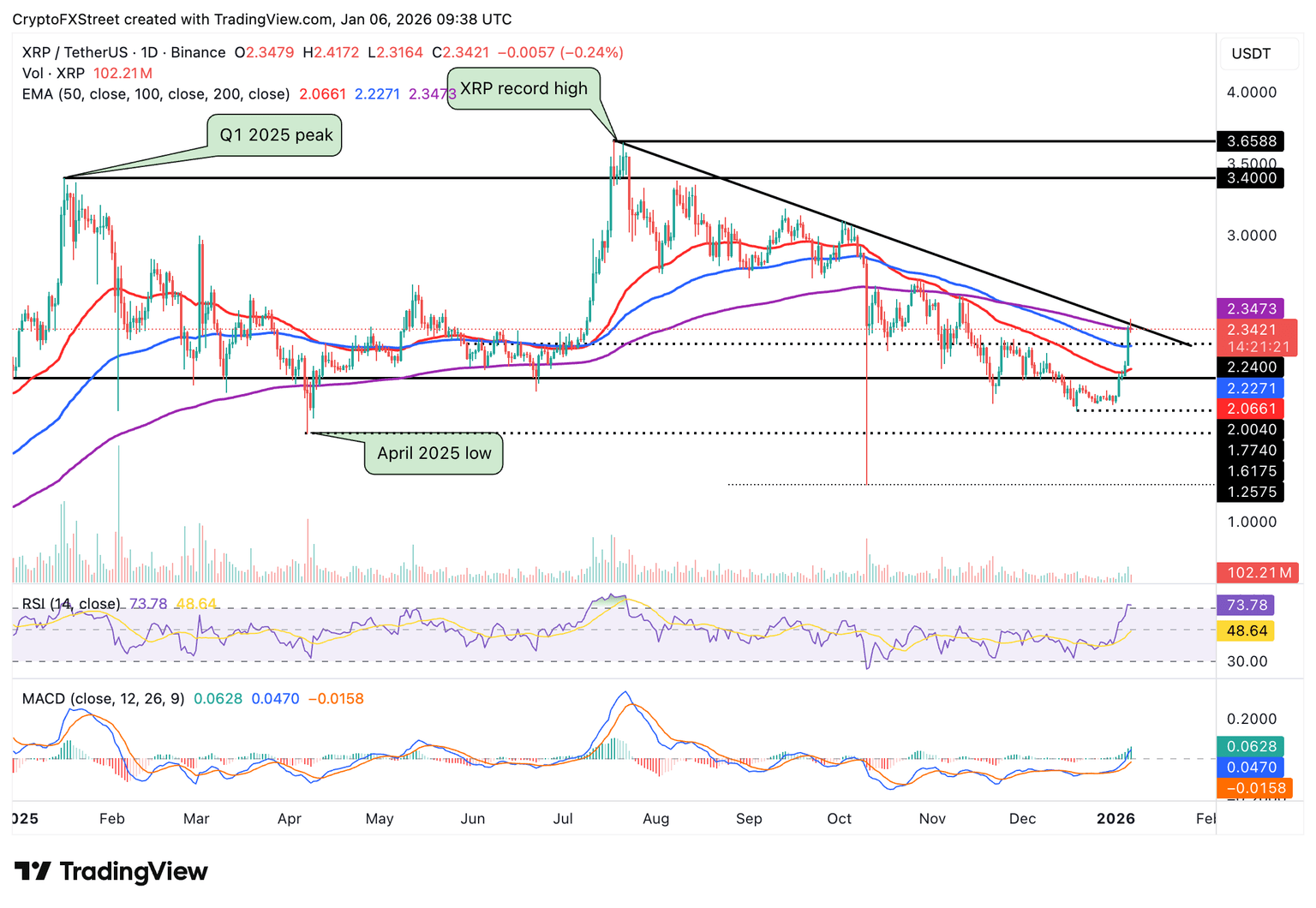 En cuanto a XRP, la recuperación se ha estancado alrededor de la EMA de 200 días en 2.35$ en el momento de escribir el martes. Una línea de tendencia descendente desde el máximo histórico de 3.66$ también limita el alza.