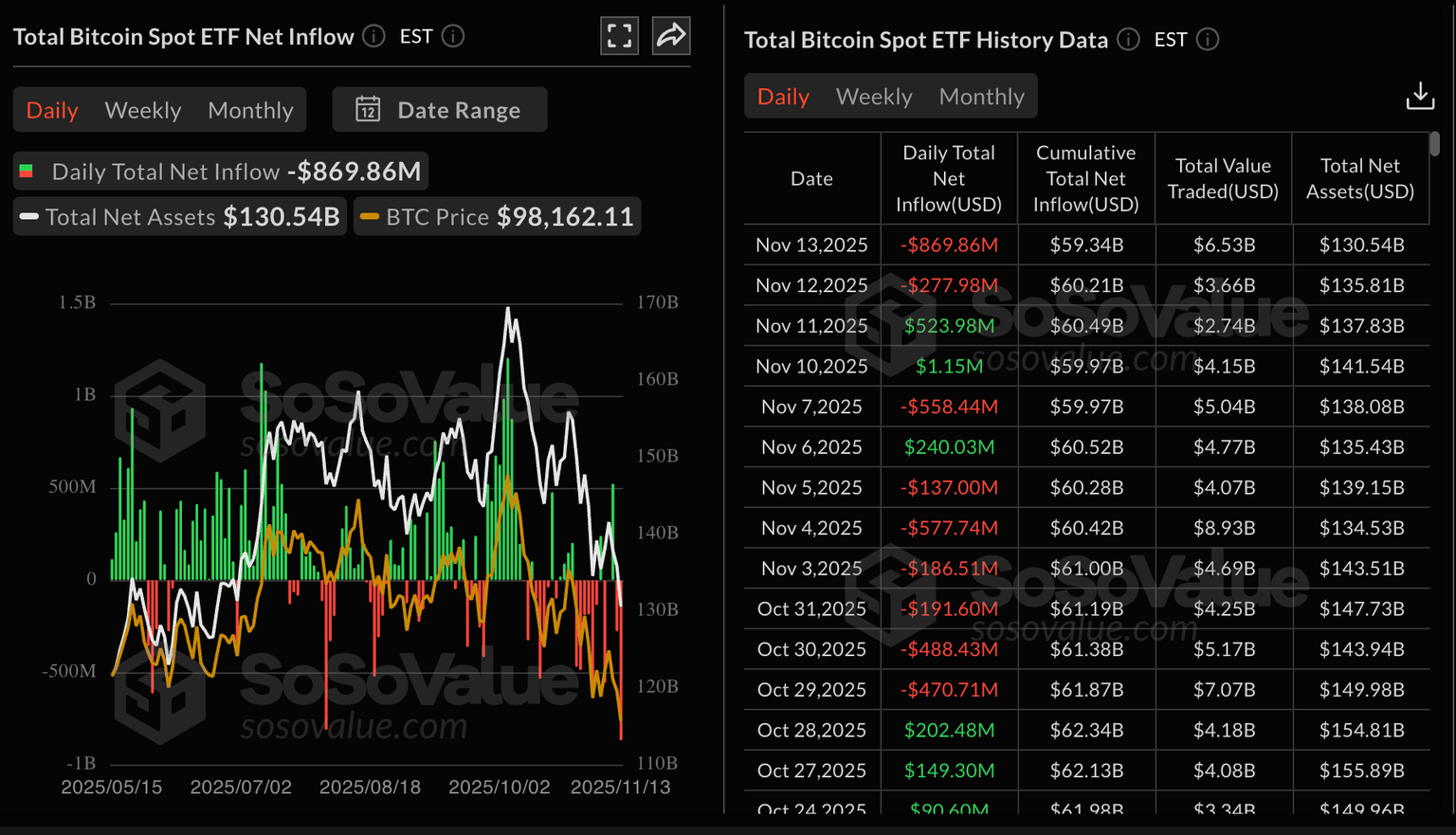 El Bitcoin enfrenta una importante salida de inversores institucionales, con los Fondos Cotizados en Bolsa (ETFs) extendiendo las salidas. Los datos de SoSoValue muestran que los ETFs de Bitcoin al contado listados en EE.UU. experimentaron aproximadamente 870 millones de dólares en salidas el jueves, la cifra más alta desde el 7 de octubre.