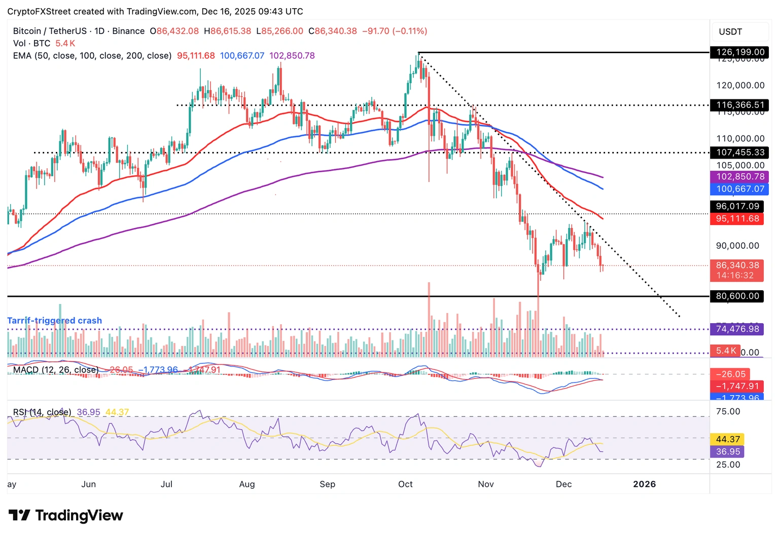 Bitcoin está cotizando por encima de 86.000$ en el momento de escribir este artículo el martes, socavado por una creciente presión de venta. La media móvil exponencial (EMA) de 50 días en descenso en 95.111$, la EMA de 100 días en 100.667$ y la EMA de 200 días en 102.850$ apoyan la perspectiva bajista.