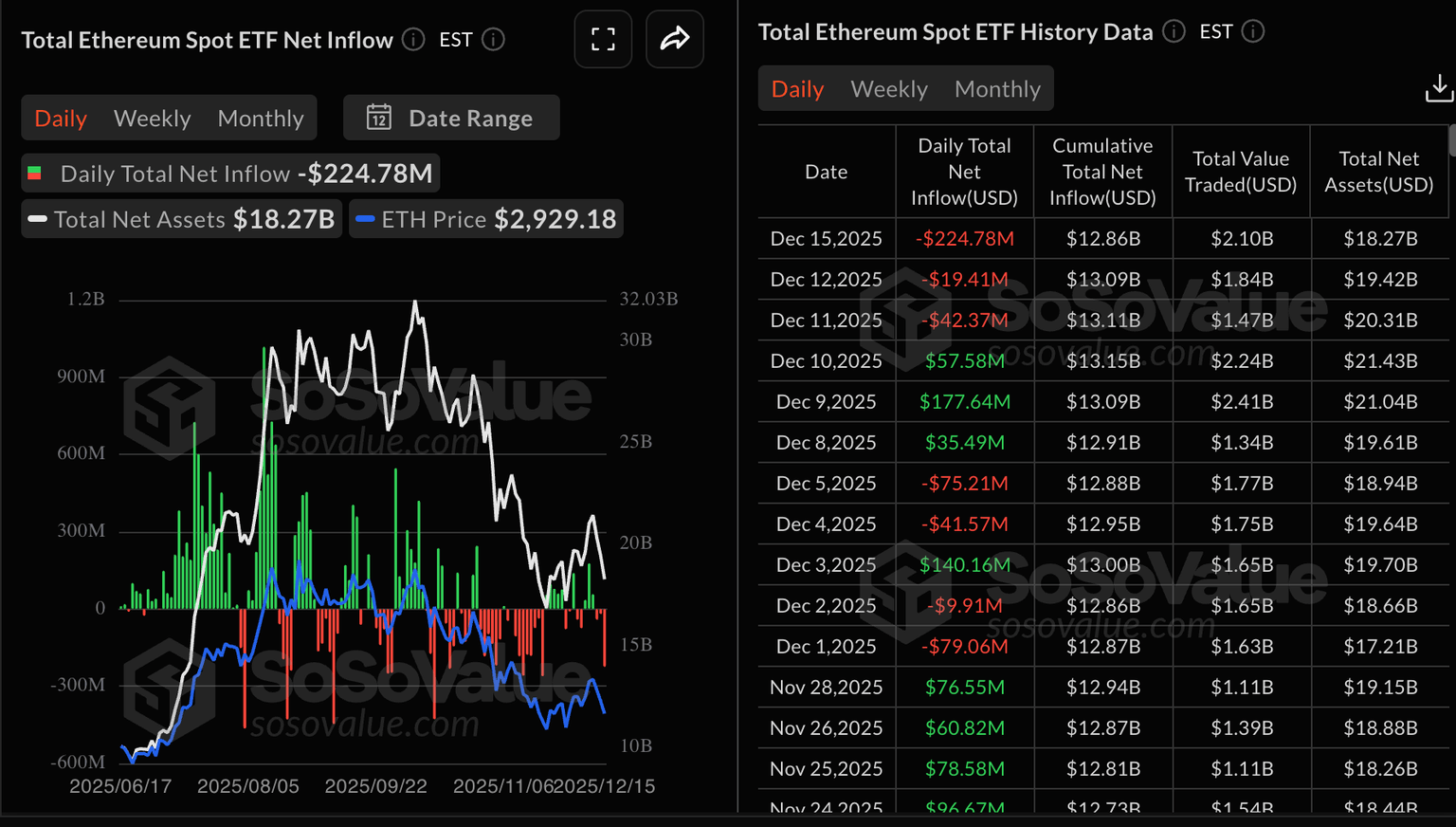 Los ETFs de Ethereum extendieron su racha de salidas por tercer día consecutivo, con casi 225 millones de dólares retirados el lunes. Los datos de SoSoValue muestran un volumen de entradas acumulado de 12.86 mil millones de dólares y activos netos de 18.27 mil millones de dólares. El ETF ETHA de BlackRock registró las mayores salidas con 139 millones de dólares, seguido por el ETHE de Grayscale con 35 millones de dólares.