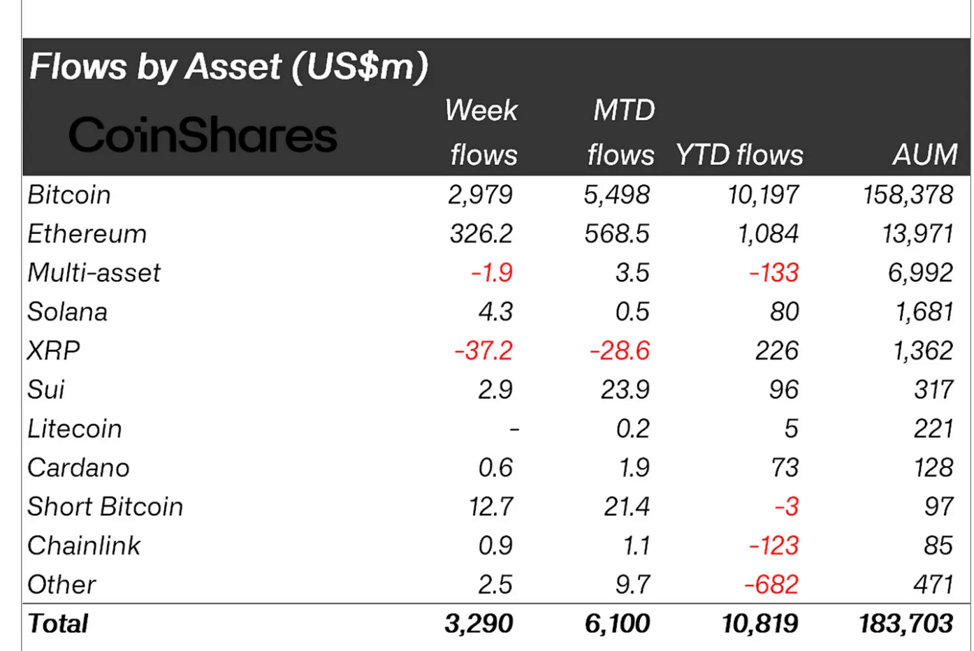 Bitcoin lideró las altcoins, logrando 2.9 mil millones de dólares en entradas, contribuyendo significativamente a un récord acumulado en lo que va del año (YTD) de 10.8 mil millones de dólares. En comparación, el total de activos bajo gestión (AUM) alcanzó temporalmente un máximo histórico de 187.5 mil millones de dólares a principios de la semana.