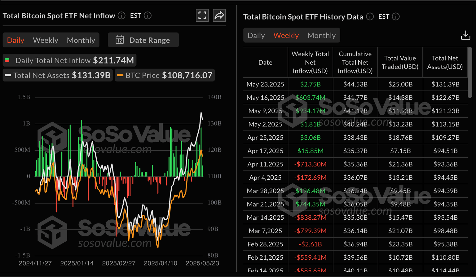 Flujos semanales de ETFs de Bitcoin | Fuente: SoSoValue