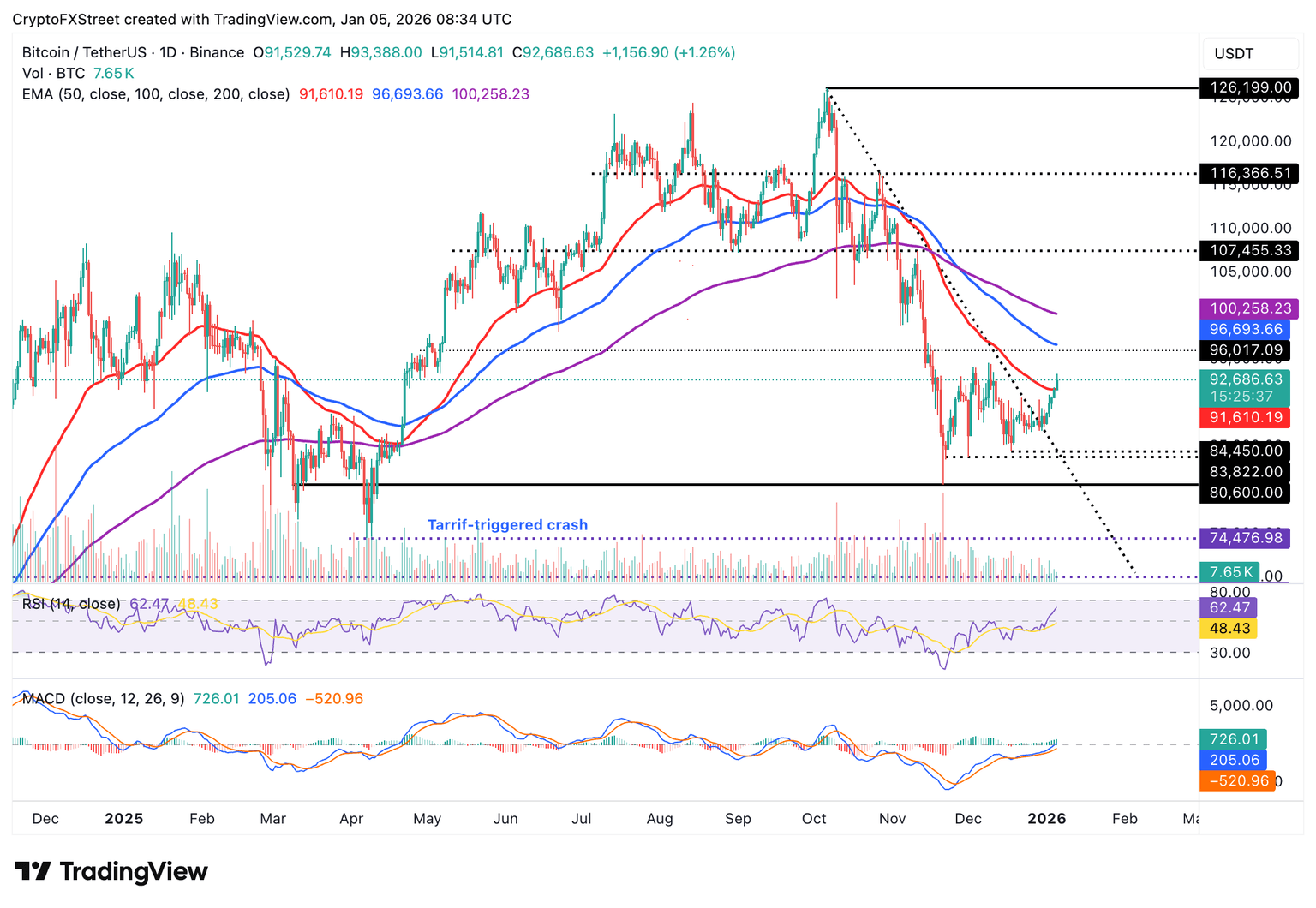 El Bitcoin se está negociando por encima de la media móvil exponencial (EMA) de 50 días en 91.610$ en el momento de escribir este artículo el lunes. Ha subido más del 1% en el día y se sitúa por encima de 92.500$. Un Índice de Fuerza Relativa (RSI) en tendencia alcista se mantiene en 62 en el gráfico diario, lo que refuerza la perspectiva alcista de BTC.
