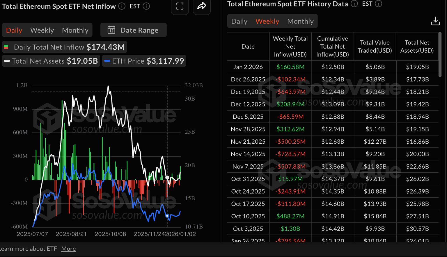 Los ETFs de Ethereum al contado reanudaron las entradas la semana pasada, totalizando aproximadamente 161 millones de dólares. Esta entrada siguió a dos semanas consecutivas de salidas, lo que puede señalar un creciente interés entre los inversores institucionales. Aproximadamente 174 millones de dólares en entradas se registraron el viernes, empujando el volumen de entrada acumulativa a 12.500 millones de dólares y los activos netos a 19.050 millones de dólares.