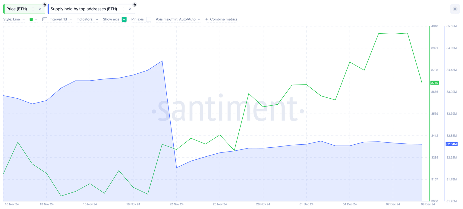 El gráfico de Santiment a continuación muestra cambios en tiempo real en los saldos mantenidos por las 1.000 carteras con las mayores tenencias de ETH.