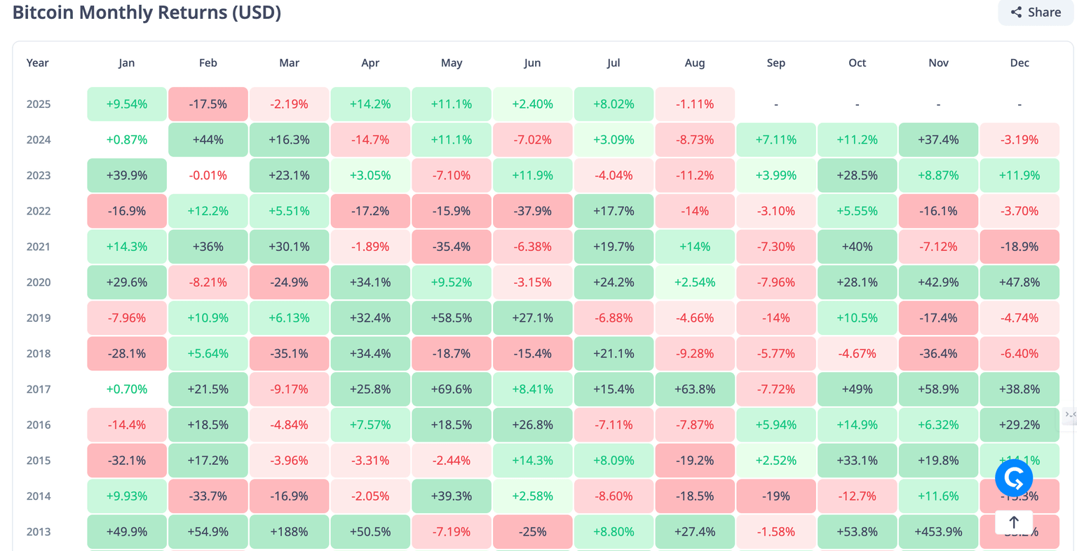 Retornos mensuales de Bitcoin | Fuente: CryptoRank