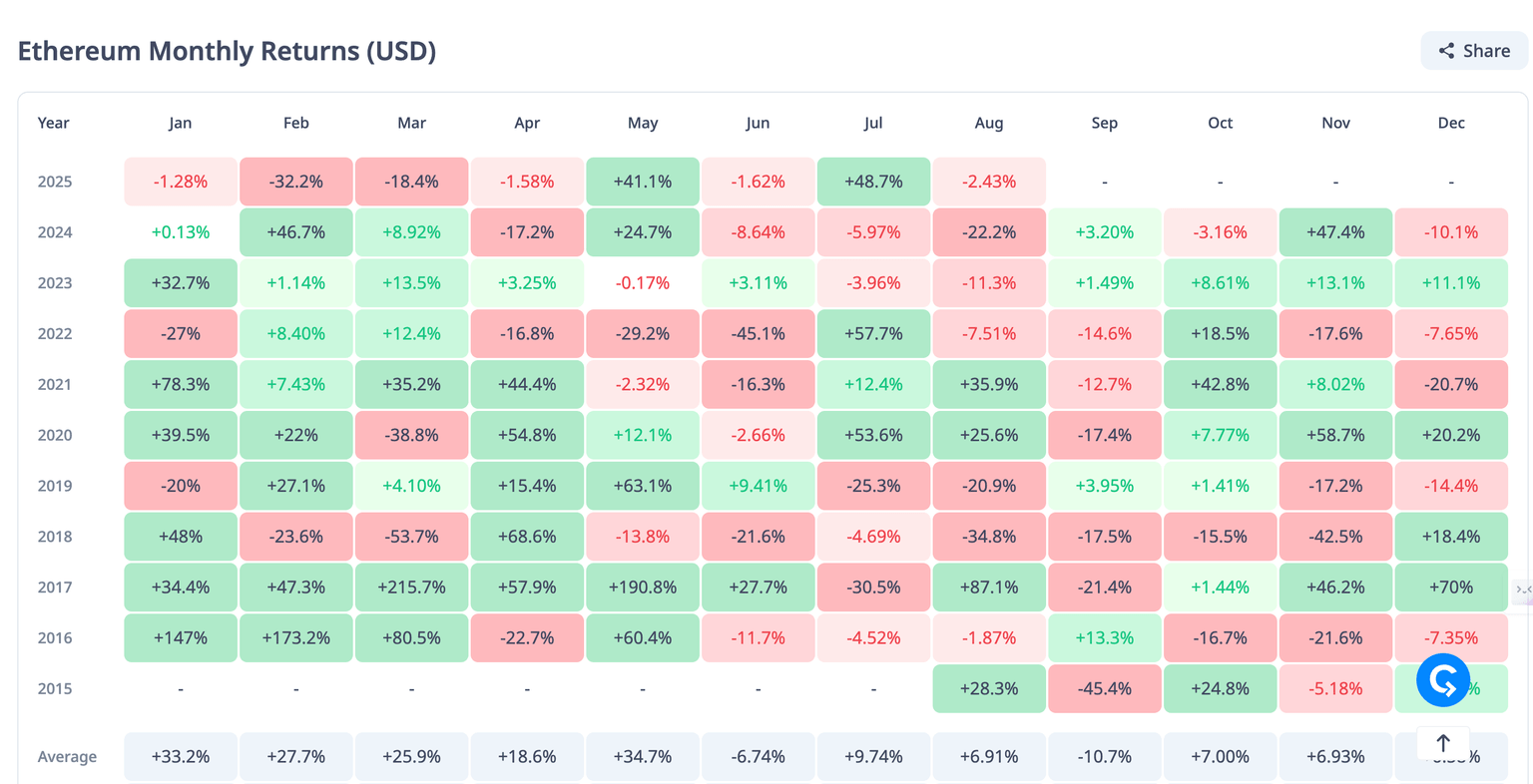 Retornos mensuales de Ethereum | Fuente: CryptoRank