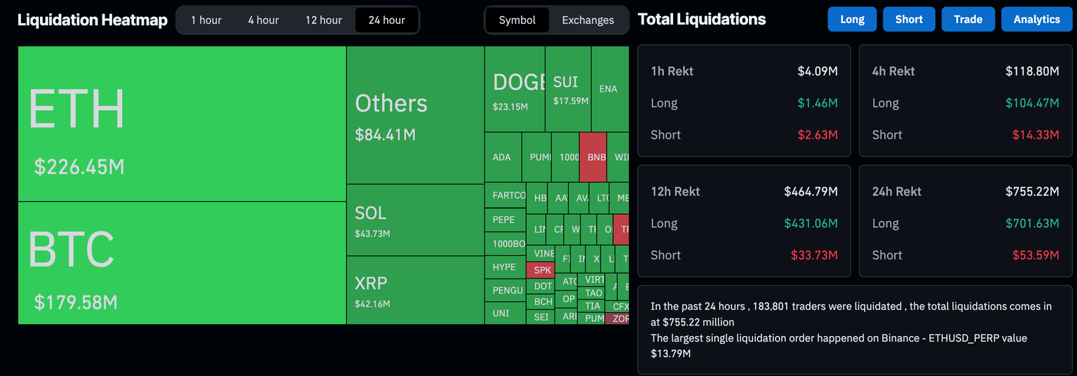 Los operadores apalancados han sido golpeados con fuerza, con liquidaciones en el mercado de derivados alcanzando los 755 millones de dólares en las últimas 24 horas. Ethereum lidera con las mayores liquidaciones de 226 millones de dólares, seguido por Bitcoin con 180 millones de dólares, Solana (SOL) con 44 millones de dólares y XRP con 42 millones de dólares, según CoinGlass.