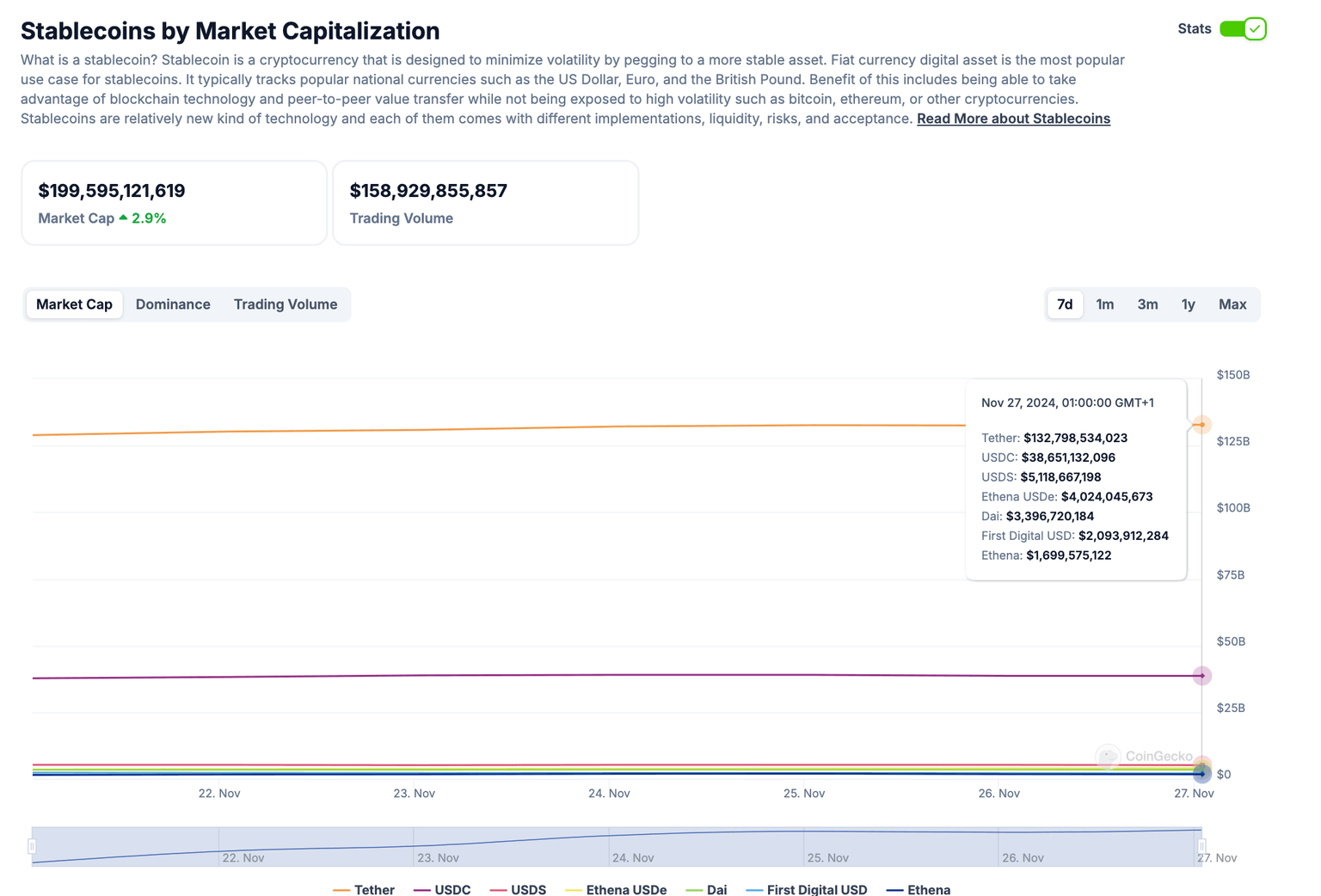 El gráfico de Coingecko anterior muestra que la capitalización total del mercado de stablecoins creció un 2,9% en las últimas 24 horas para alcanzar la marca de 199,6 mil millones de dólares.