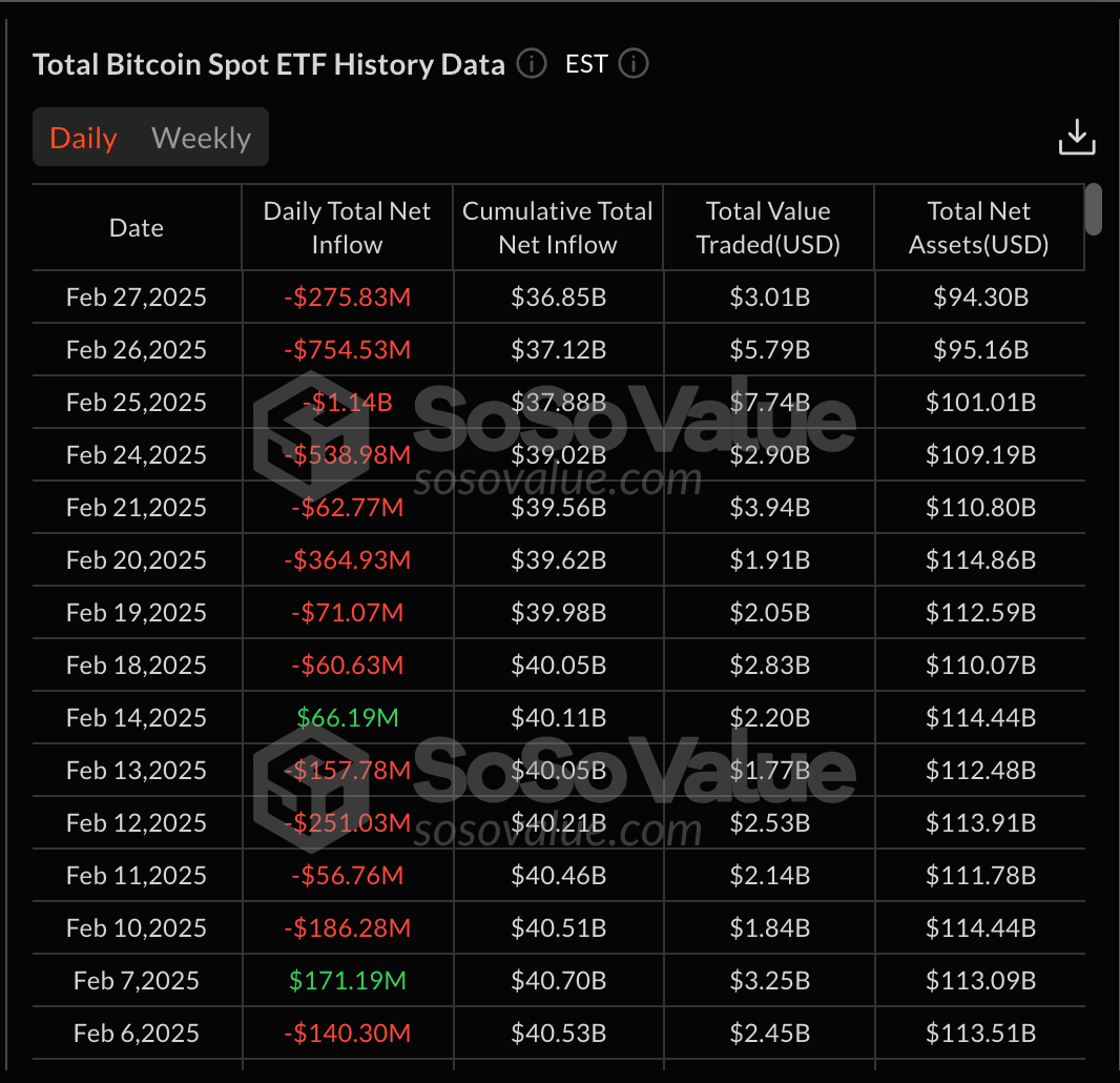 Uno de los factores clave que pesa sobre la acción del precio de Bitcoin ha sido la persistente salida de los ETFs de Bitcoin al contado, como ilustra los últimos datos de SosoValue.