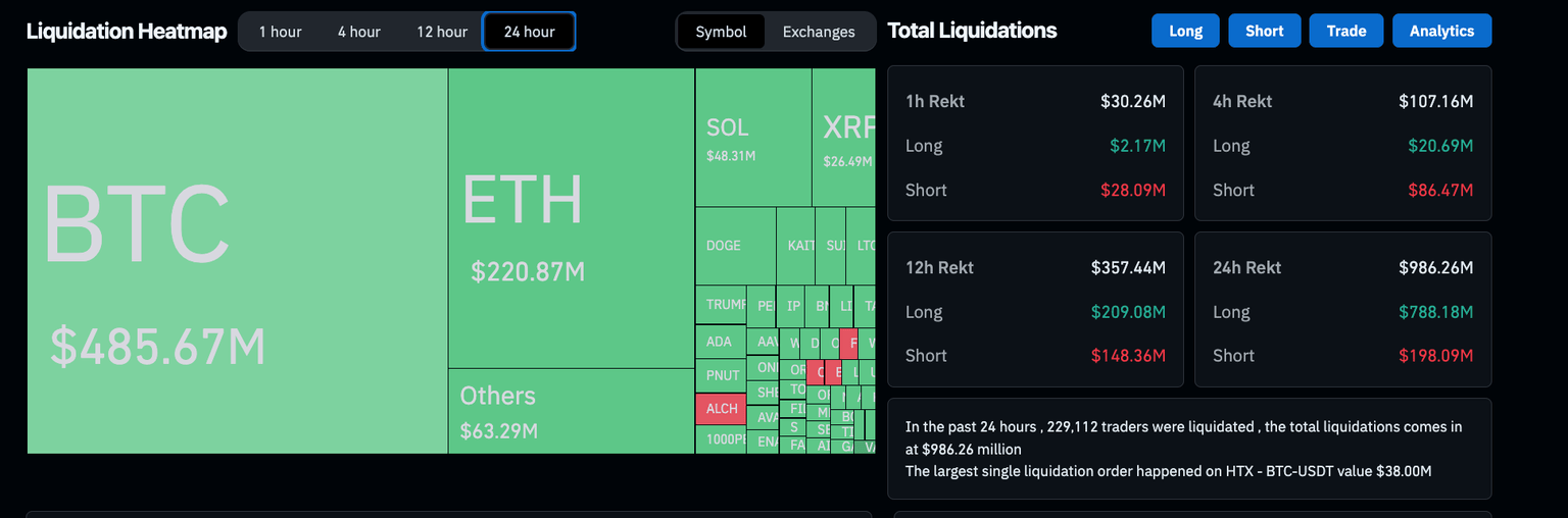- En las últimas 24 horas, las liquidaciones del mercado de derivados de Bitcoin alcanzaron los 485 millones de dólares, según datos de Coinglass.
