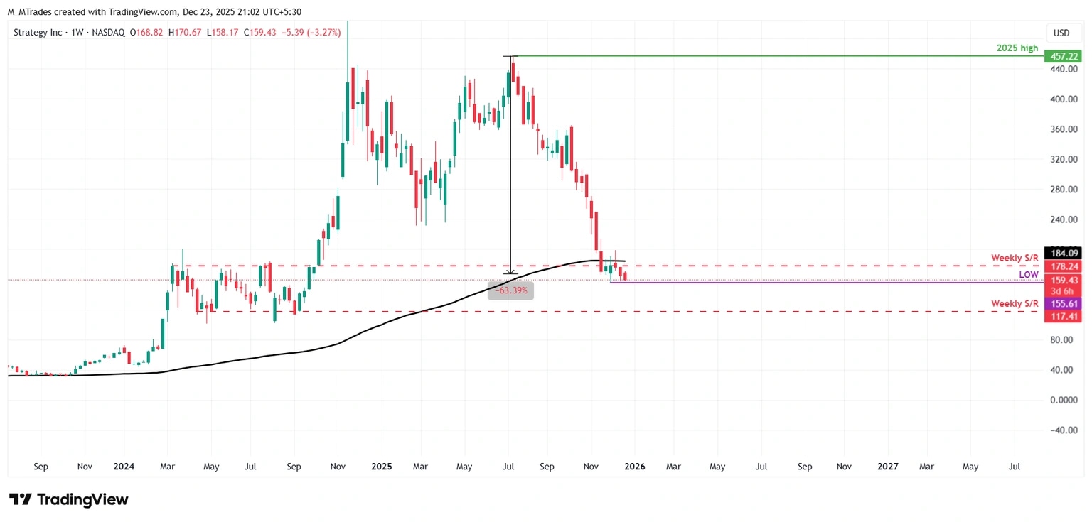 Strategy (MSTR) y otras tesorerías corporativas de Bitcoin (BTC) permanecen bajo presión ya que el rendimiento volátil de BTC en 2025 – marcado por fuertes repuntes y correcciones profundas – dejó los rendimientos anuales planos o ligeramente negativos. Los precios de las acciones de MSTR han caído más de un 60% desde sus máximos anuales, mientras que los pares que recaudaron capital a través de Inversión Privada en Capital Público (PIPE) también han visto erosionarse sus precios de acciones hacia sus niveles de emisión.