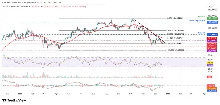 El Bitcoin fue rechazado en la resistencia psicológica de 90.000$ el lunes, pero encontró soporte en el retroceso de Fibonacci del 78.6% en 85.569$, llevando a una consolidación entre estos niveles hasta el miércoles. Sin embargo, el jueves el BTC cayó y cerró por debajo del nivel de 85.569$. En el momento de escribir el viernes, se cotiza alrededor de 85.300$. Si el BTC continúa su tendencia a la baja, podría extender la caída hacia el nivel psicológico de 80.000$.