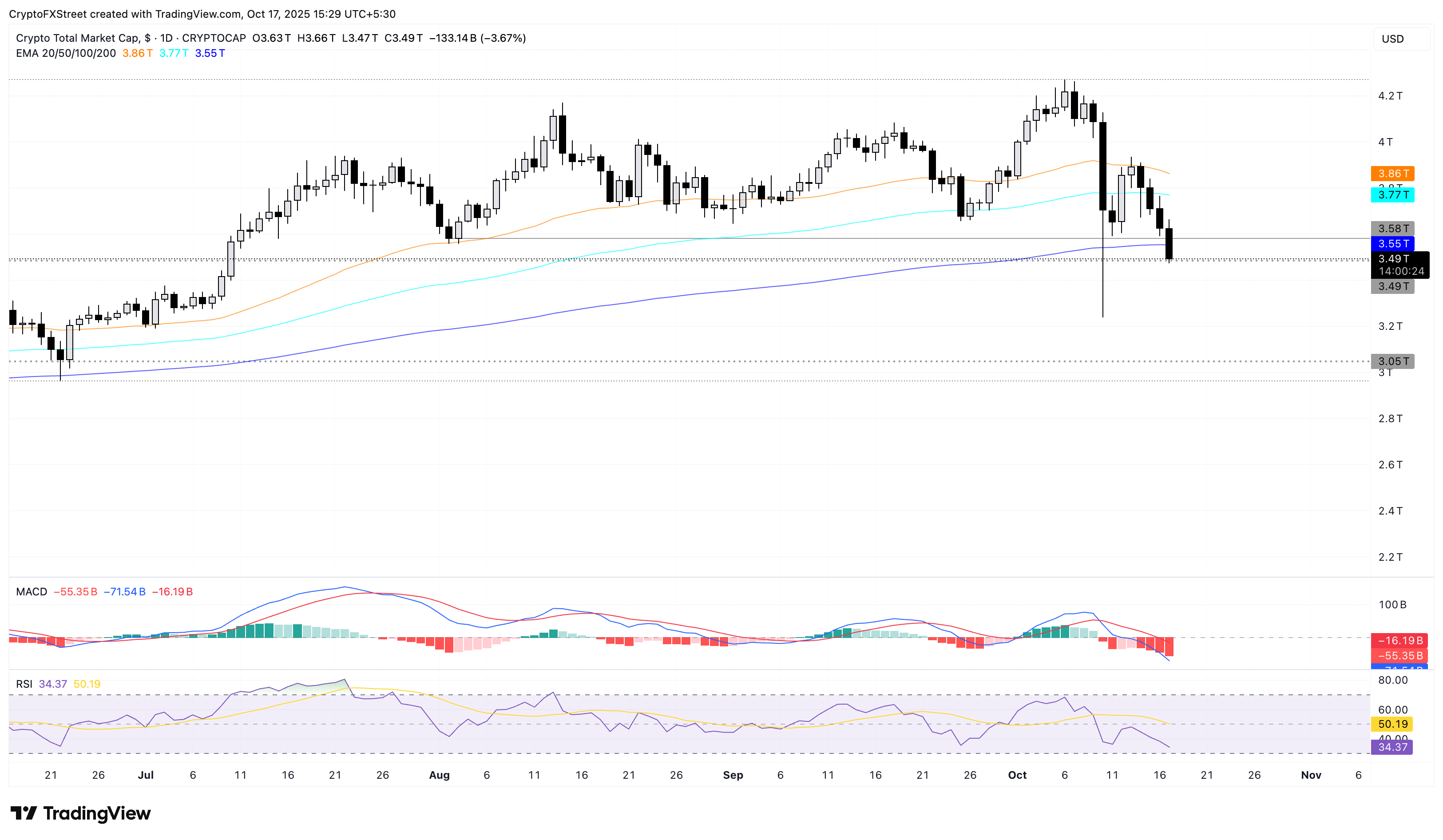 Las altcoins están soportando la mayor carga, con Ethereum (ETH) cayendo a 3.700$ y Ripple (XRP) deslizándose por debajo de un soporte clave en 2.22$. La capitalización total del mercado ha bajado un 6% en las últimas 24 horas a 3.76 billones de dólares después de alcanzar un máximo de 4.38 billones de dólares el 7 de octubre, según CoinGecko.