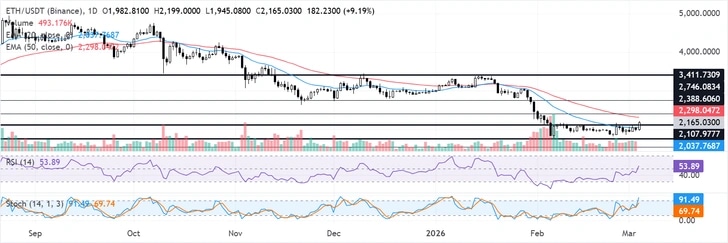 Ethereum (ETH) ha saltado por encima de 2.100$ el miércoles, tras una recuperación general en el mercado de criptomonedas. El movimiento fue acompañado por un repunte en el interés abierto (OI) de Ethereum, que ha aumentado a 13.43M ETH — su nivel más alto desde el 31 de enero. El OI de la principal altcoin ha estado en aumento desde el 19 de febrero, añadiendo 1.2M ETH en las últimas dos semanas. El crecimiento se produce en medio de 152 millones de dólares en liquidaciones de Ethereum en las últimas 24 horas, dominadas por 129 millones de dólares en liquidaciones cortas, según datos de Coinglass.