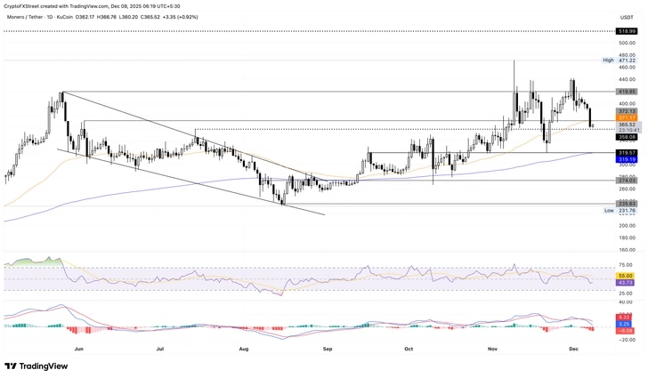 Monero cotiza por debajo de su media móvil exponencial (EMA) de 50 días en 371$ tras la caída del 8% el domingo, que marcó la cuarta vela bajista consecutiva en el gráfico diario. En el momento de escribir, XMR se mantiene estable con un aumento del 1% el lunes mientras los toros defienden el nivel de 350$. Una posible caída por debajo de este nivel podría extender la tendencia a la baja hasta la EMA de 200 días en 319$.