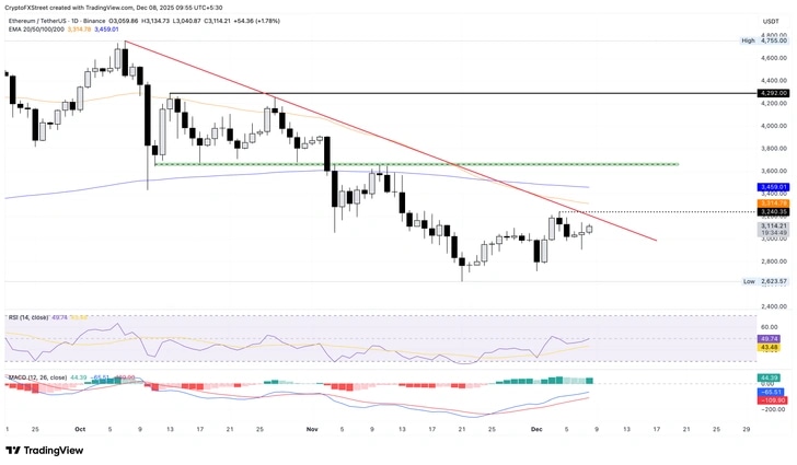 Ethereum sube casi un 2% en el momento de la publicación el lunes, luchando por superar la línea de tendencia de resistencia que conecta los máximos del 7 y 27 de octubre en el gráfico diario. Si la altcoin principal supera el máximo del jueves en 3.240$ con un cierre decisivo, podría apuntar a la EMA de 200 días en 3.459$. Similar a Bitcoin, Ethereum está ganando tracción, evidenciado por el RSI que sube a 49 mientras el MACD se estabiliza hacia la línea cero.
