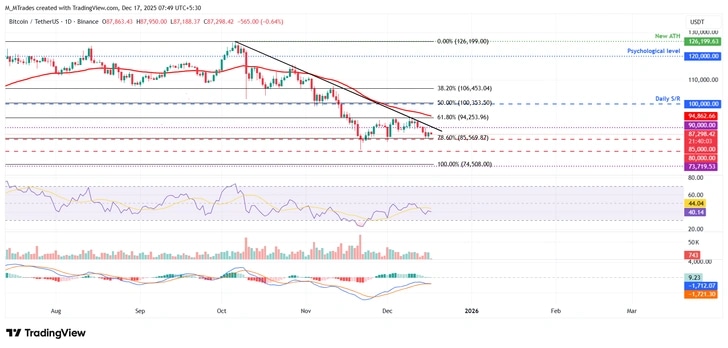 El precio del Bitcoin fue rechazado de una línea de tendencia descendente (dibujada conectando múltiples máximos desde principios de octubre) el viernes y ha disminuido casi un 7% desde entonces, volviendo a probar el nivel de soporte de 85.569$ el lunes. Sin embargo, BTC se recuperó ligeramente el martes después de encontrar soporte en 85.569$. En el momento de escribir el miércoles, BTC se sitúa alrededor de 87.300$. Si BTC continúa su corrección y cierra por debajo de 85.569$ de manera diaria, lo que se alinea con el retroceso de Fibonacci del 78.6%, podría extender la caída hacia el nivel psicológico de 80.000$.