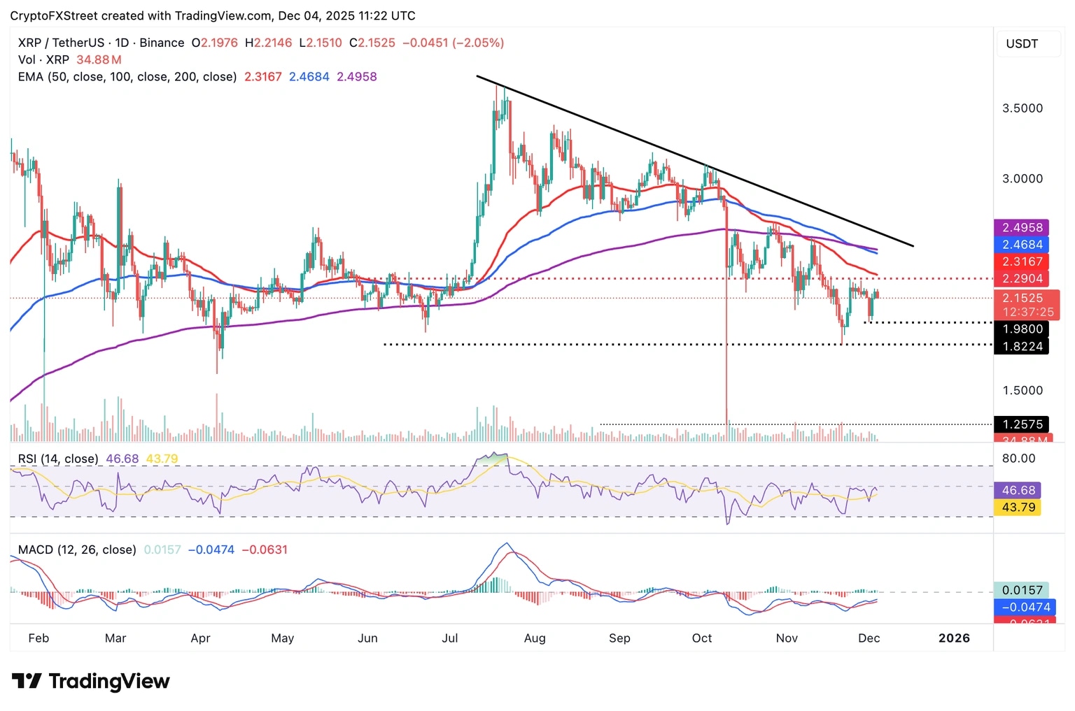 Ripple (XRP) está cotizando bajo presión en el momento de escribir estas líneas el jueves, después de que los toros no lograran romper la resistencia a corto plazo en 2.22$. La reversión puede extenderse hacia el mínimo del lunes de 1.98$, especialmente si persiste el sentimiento de aversión al riesgo en el mercado de criptomonedas en general.