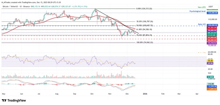 El precio del Bitcoin fue rechazado de la línea de tendencia descendente (dibujada conectando múltiples máximos desde principios de octubre) la semana pasada. Esta línea de tendencia coincide con el nivel de retroceso de Fibonacci del 61.8% en 94.253$ (dibujado desde el mínimo de abril de 74.508$ hasta el máximo histórico de 126.199$ establecido en octubre), convirtiéndolo en una zona de resistencia clave. A partir del lunes, BTC se sitúa alrededor de 89.000$. Si BTC continúa su retroceso, podría extender la caída hacia el siguiente soporte clave en 85.569$, que se alinea con el nivel de retroceso de Fibonacci del 78.6%.