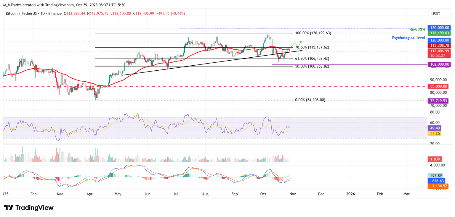 El precio del Bitcoin volvió a probar y fue rechazado del nivel de retroceso de Fibonacci del 78.6% en 115.137$ el lunes, y cayó ligeramente al día siguiente, bajando por debajo de la media móvil exponencial (EMA) de 50 días en 113.317$. En el momento de escribir el miércoles, el BTC cotiza alrededor de 112.400$, acercándose a su línea de tendencia ascendente. Si el BTC encuentra soporte alrededor de la línea de tendencia ascendente, se recupera y cierra por encima de 115.137$, podría extender el repunte hacia el nivel psicológico clave de 120.000$.