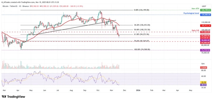Bitcoin comenzó la semana con una nota negativa y extendió su caída en un 2%, cerrando por debajo del nivel de retroceso de Fibonacci del 61.8% en 94.253$ (dibujado desde el mínimo del 7 de abril de 74.508$ hasta el máximo histórico de 126.299$ establecido el 6 de octubre). El martes, BTC cayó a 89.253$ pero rebotó desde el nivel psicológico clave de 90.000$, cerrando finalmente el día en 92.960$. En el momento de escribir el miércoles, BTC se sitúa alrededor de 92.600$.