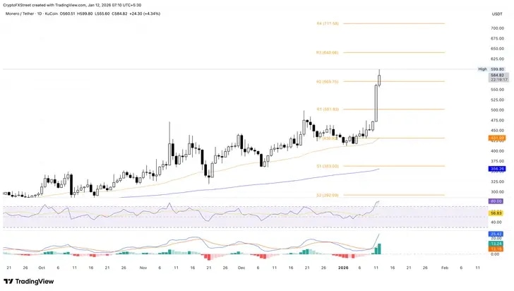 Monero se acerca a la marca de 600$, extendiendo la recuperación en modo de descubrimiento de precios. Al momento de escribir, XMR ha subido un 5% el lunes, acumulando un 18% de ganancias del día anterior. En general, XMR ha ganado casi un 35% hasta ahora este mes, ya que la crisis de los desarrolladores de Zcash impulsa la rotación de capital hacia Monero. Si Monero supera la marca de 600$, podría extender la recuperación hacia el Punto de Pivote R3 en 640$.